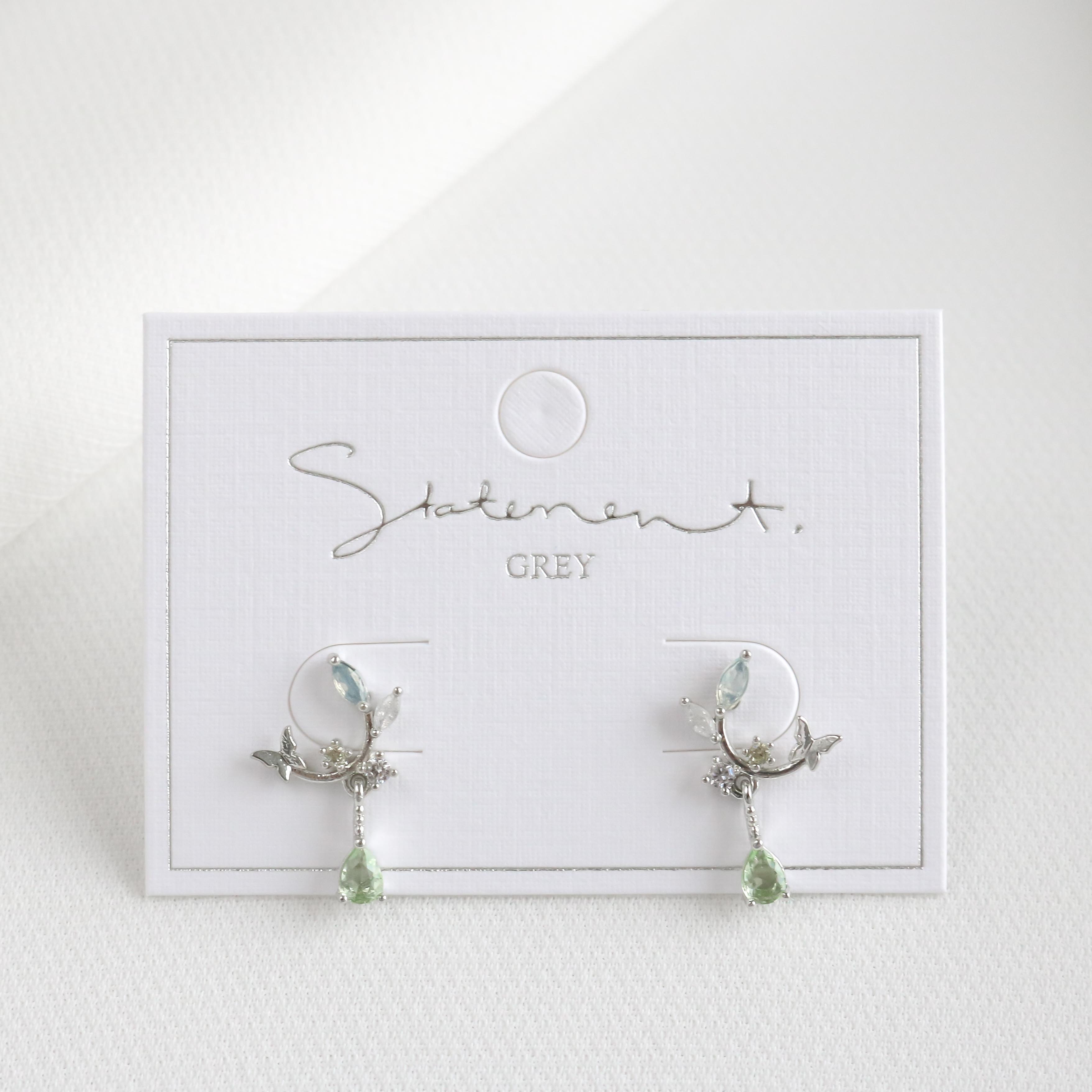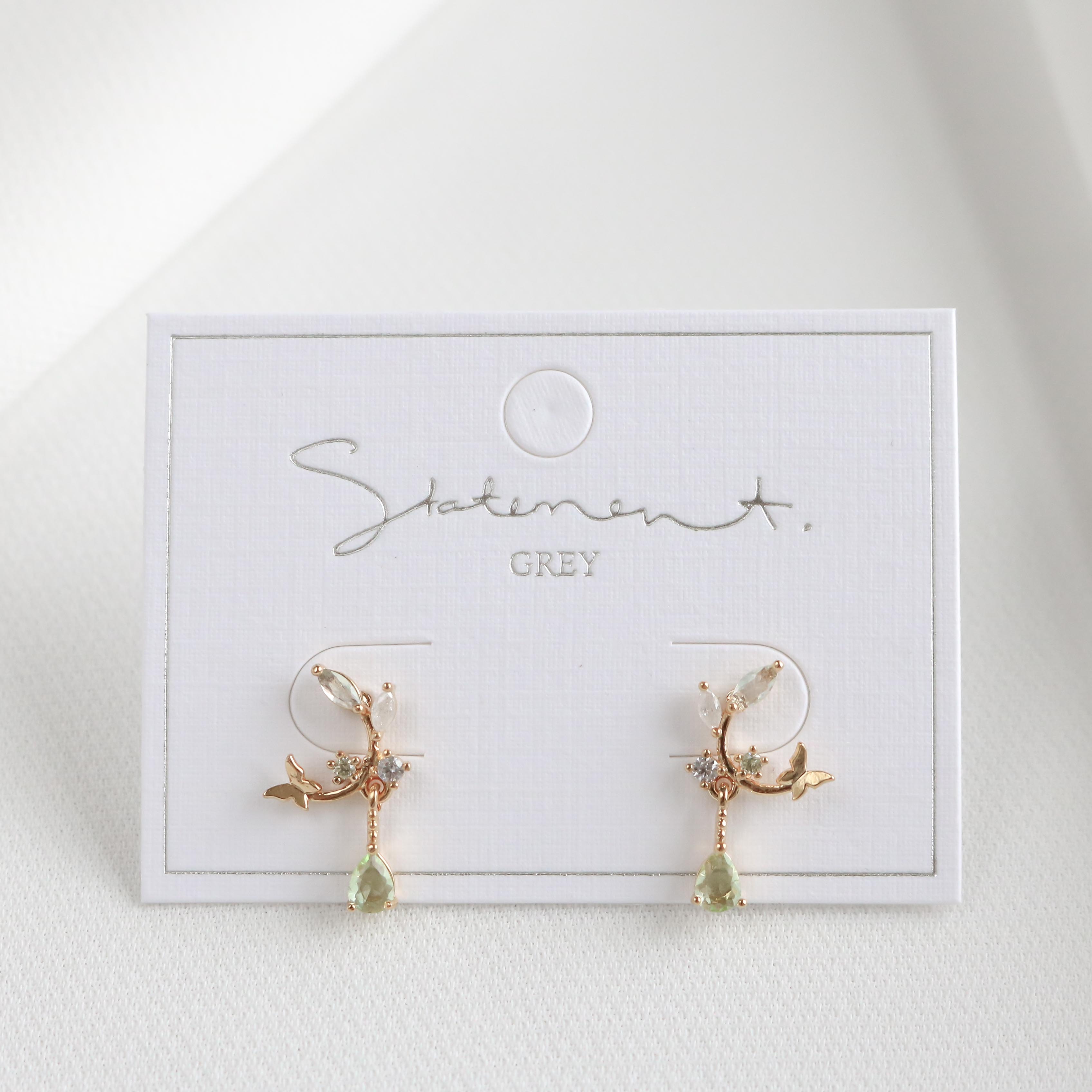 Created with faith, trust, and a little pixie dust, these Tinker-bell inspired earrings are absolutely adorable! Featuring an arched leaf branch with where a butterfly has just landed, hangs a light green crystal.