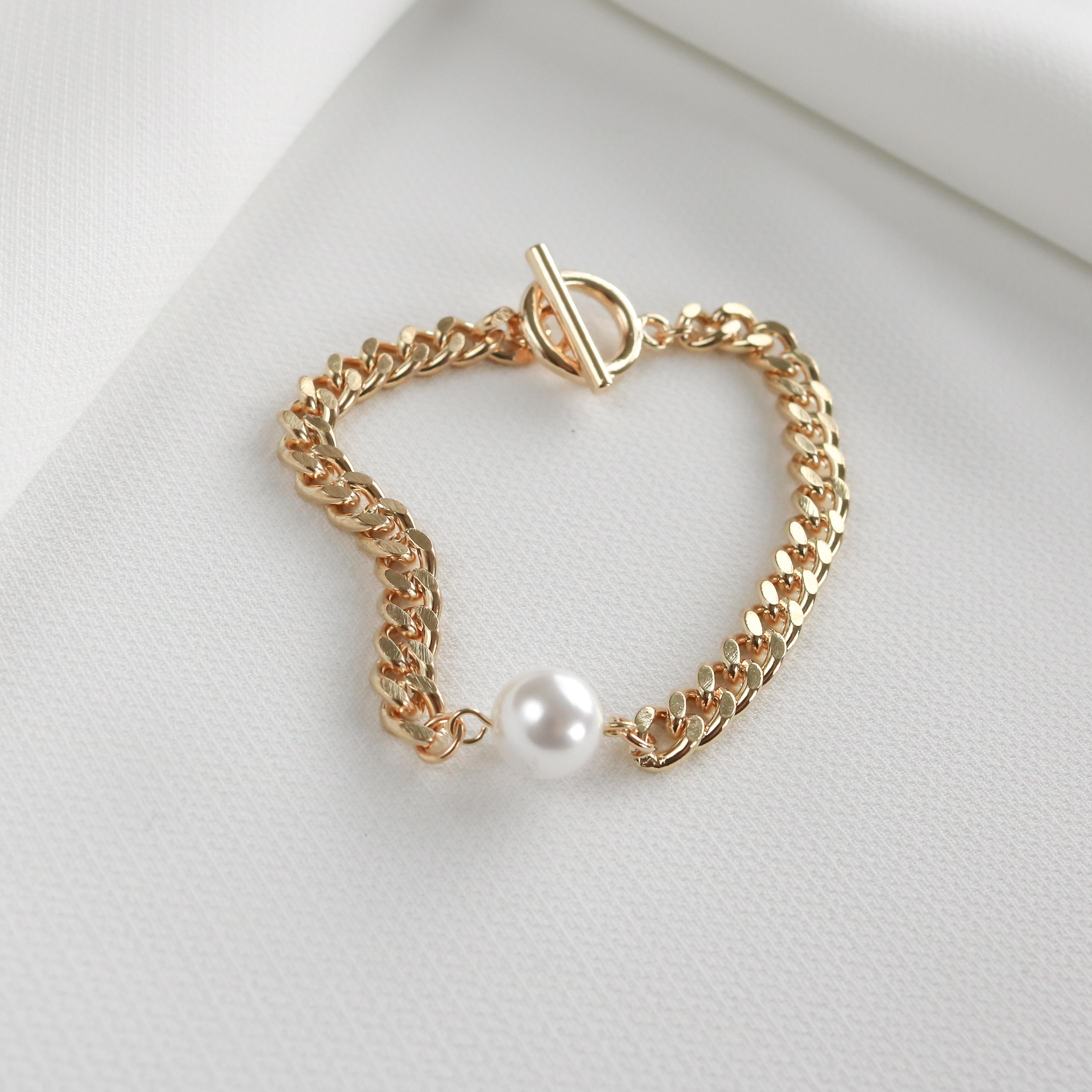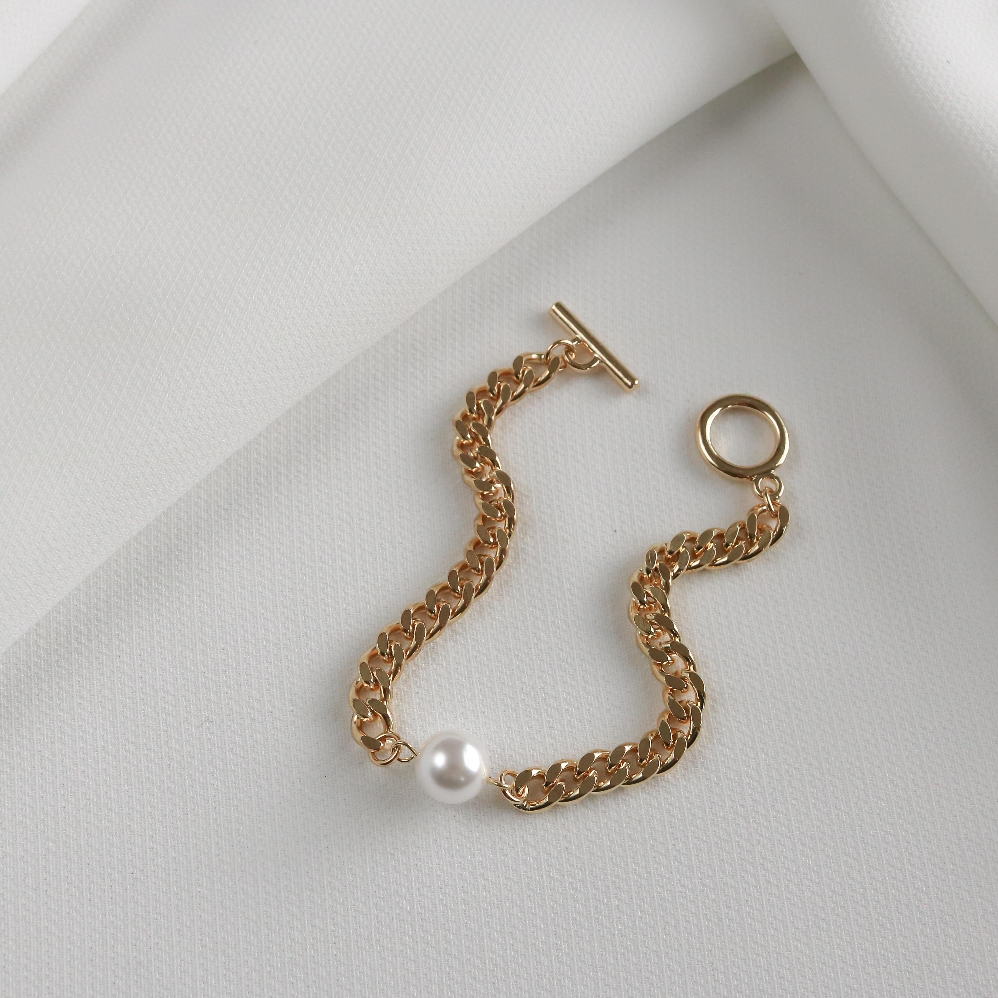 The Ford bracelet features a chunky curb chain complete with a bar and toggle closure, and finished with a faux pearl.