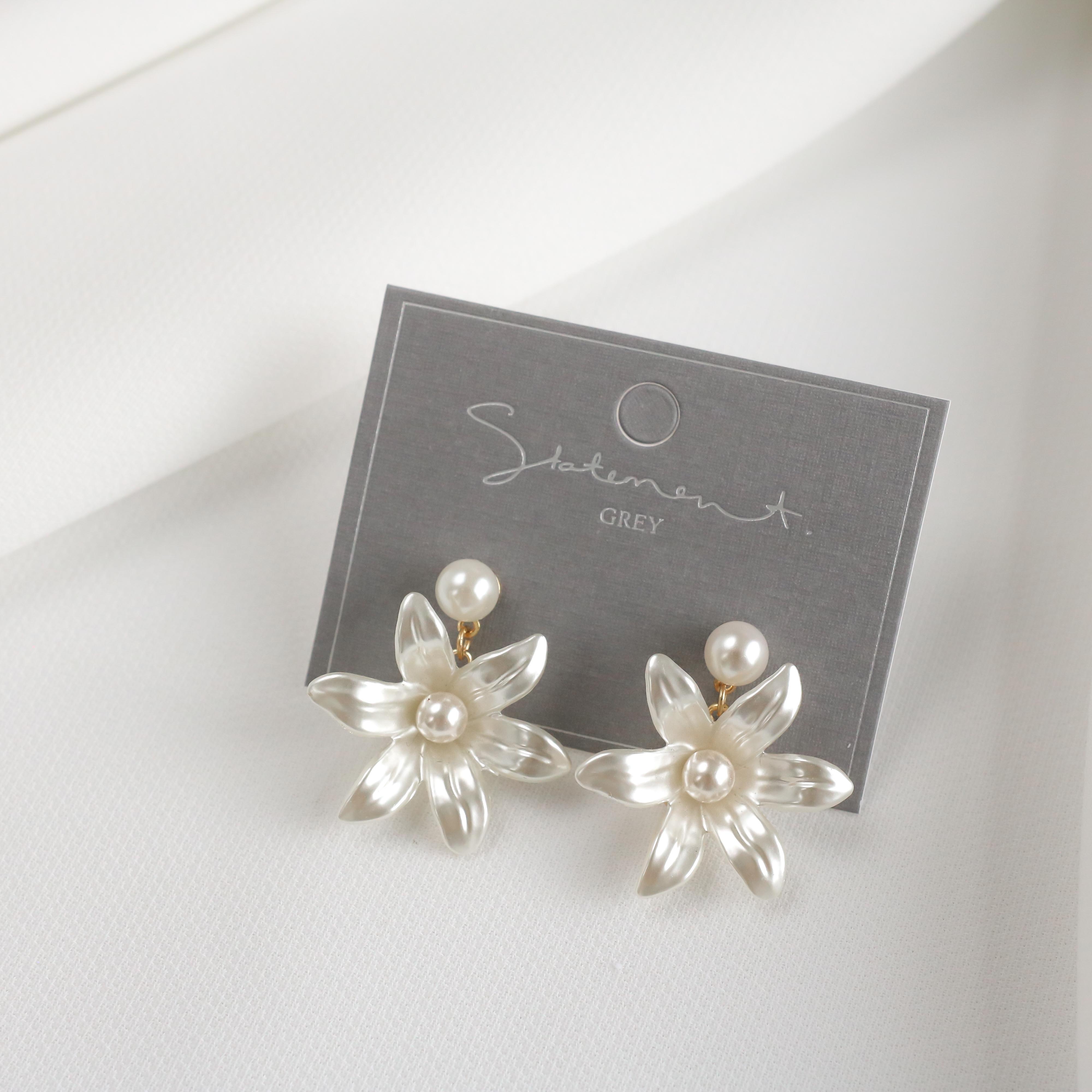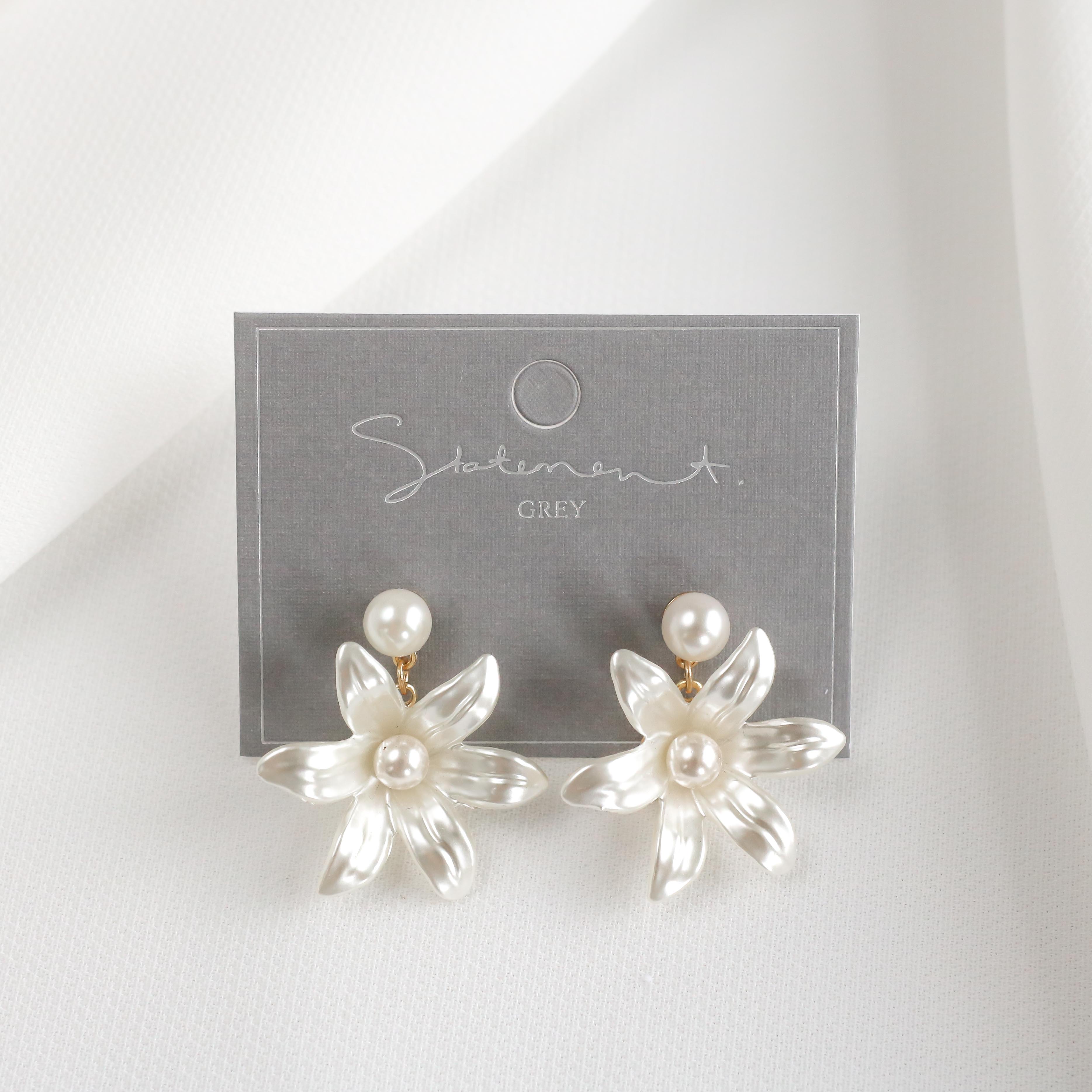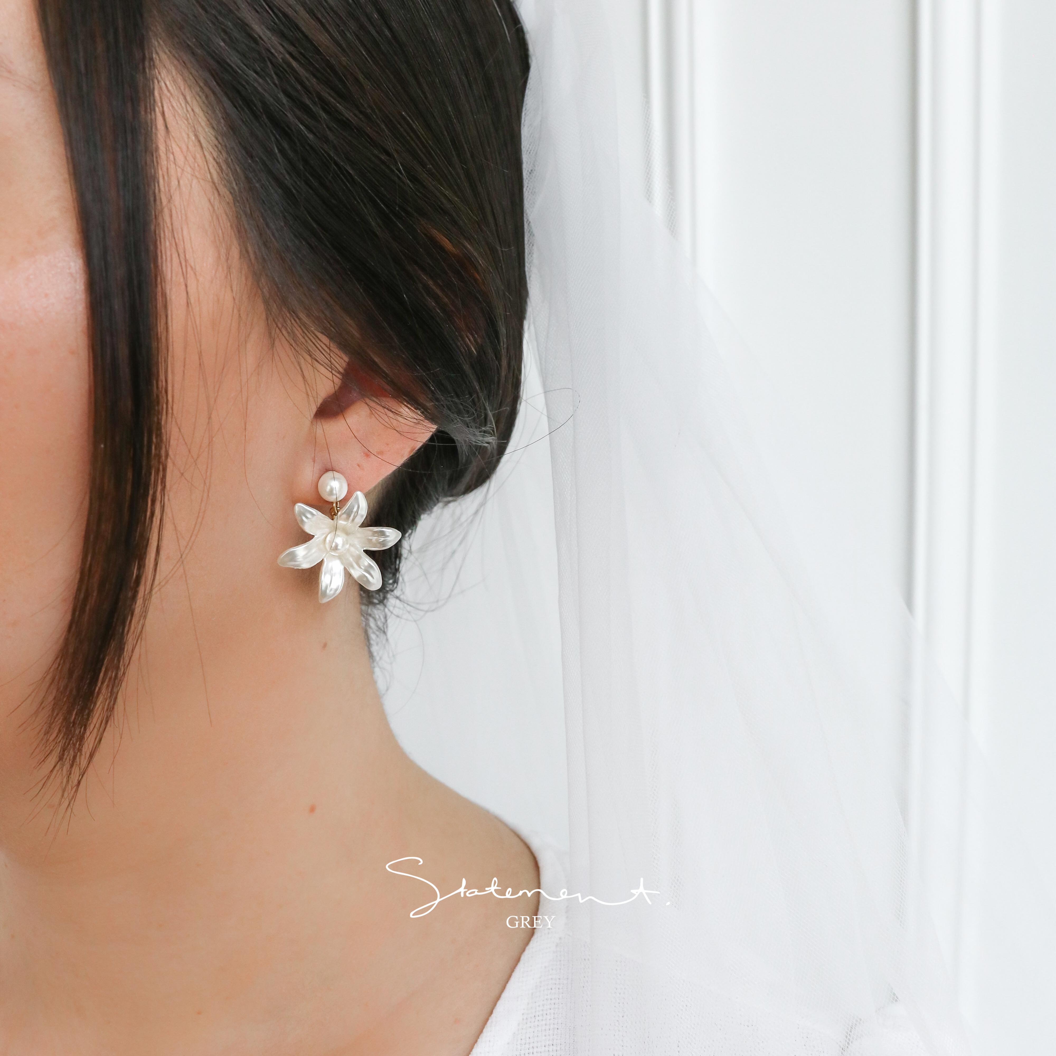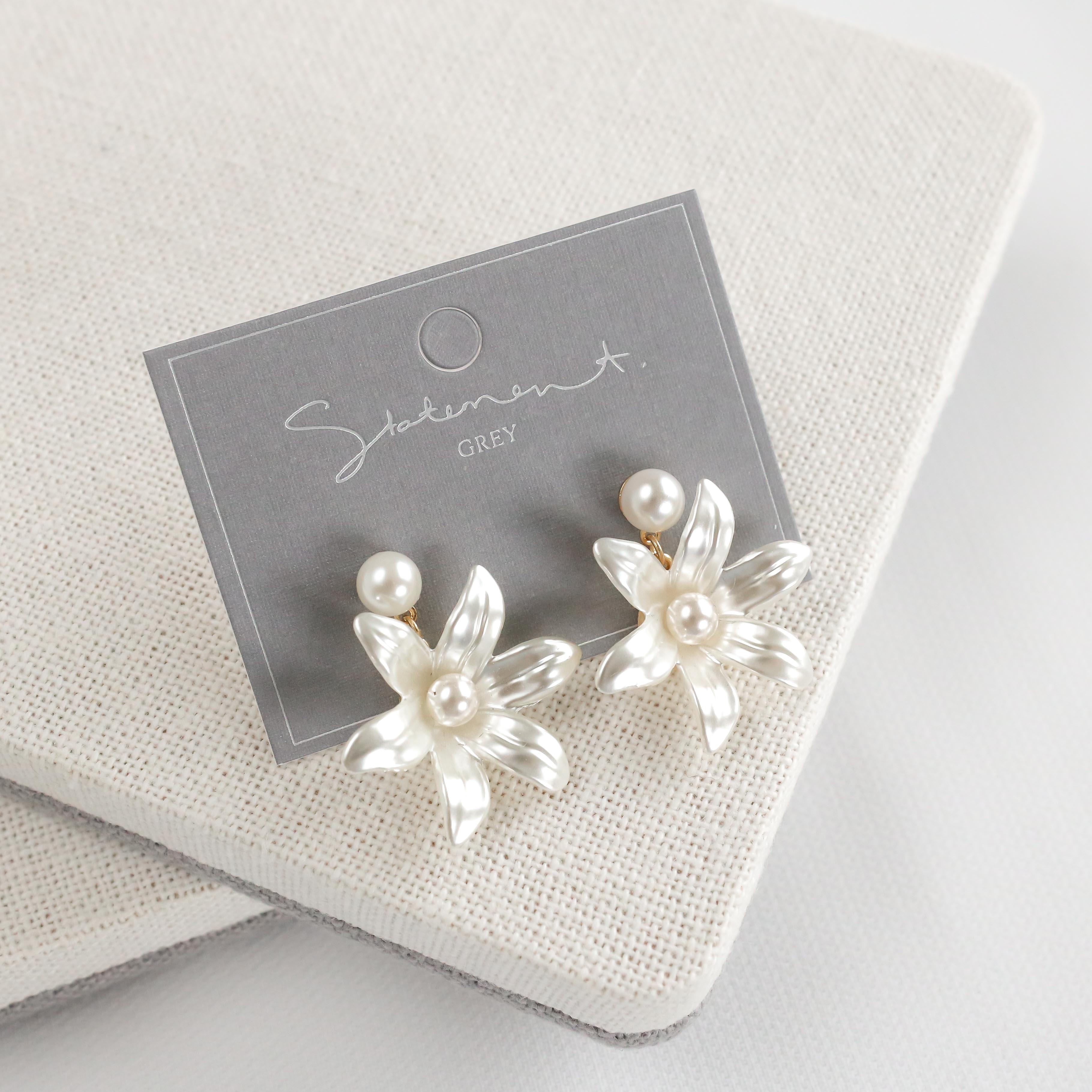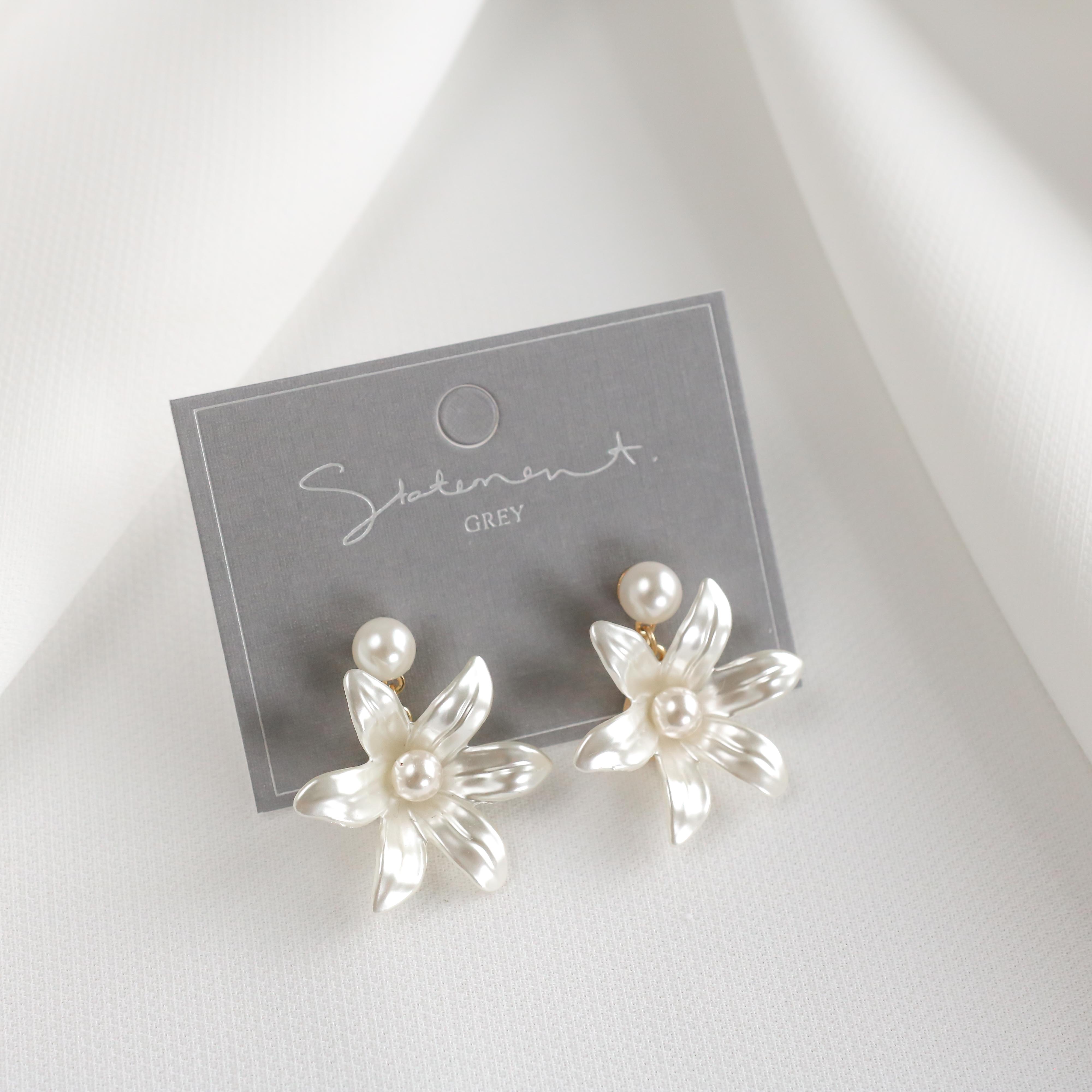 Handcrafted in-studio, these elegant Jasmine Earrings are inspired by the delicate beauty of the Jasmine flower. The pearly finish adds a touch of sophistication, making them perfect for bridal wear or any special occasion. Elevate any outfit with a touch of sophistication and grace.