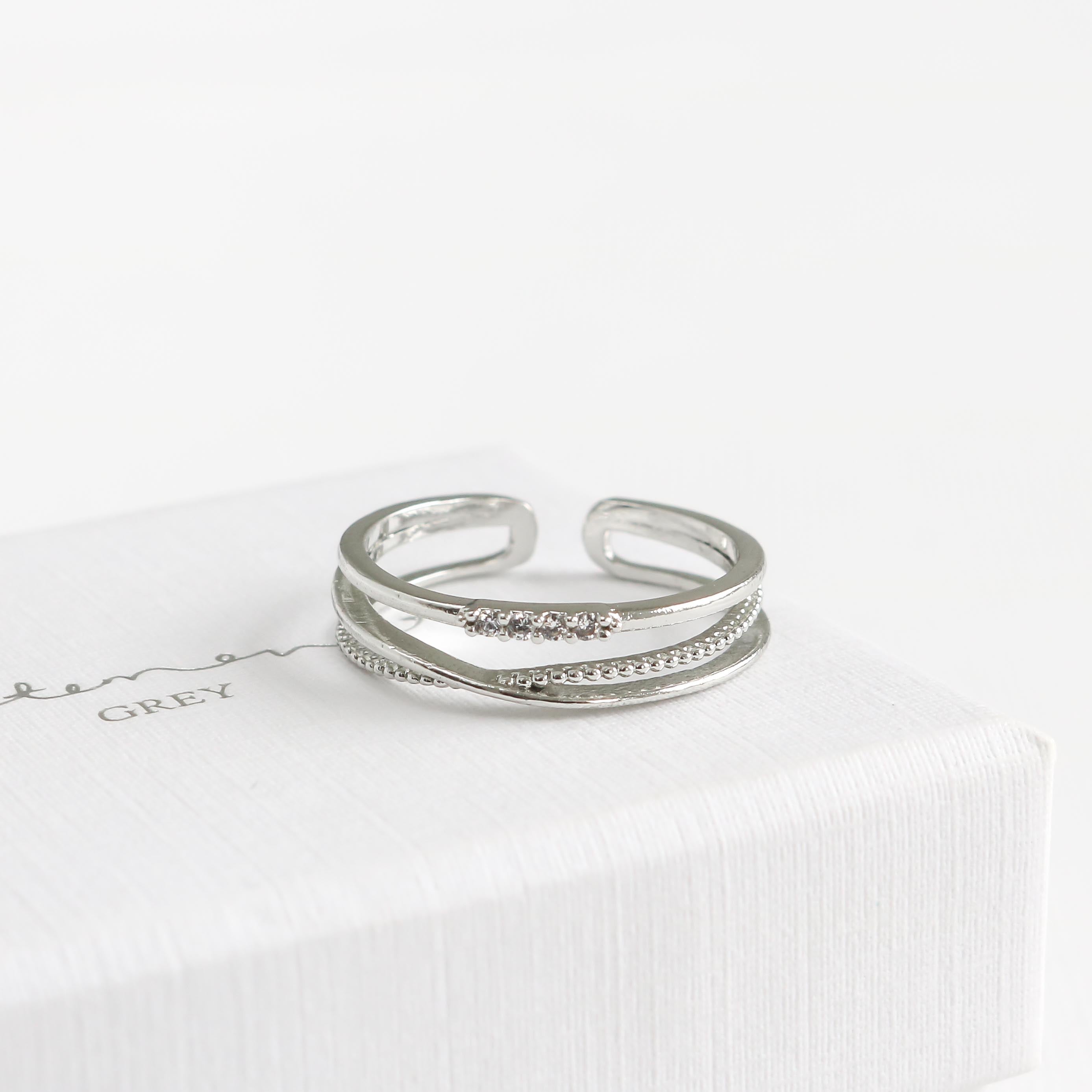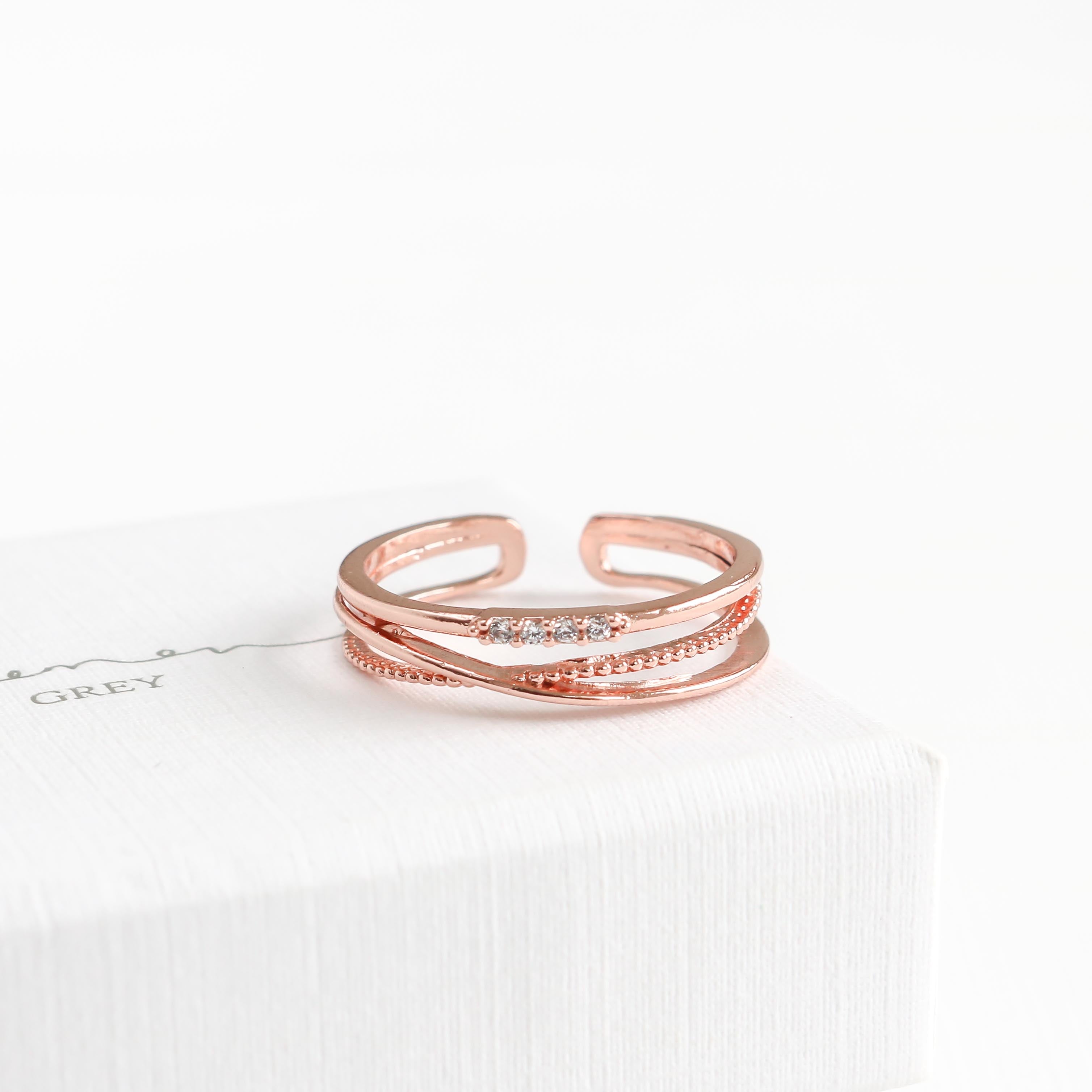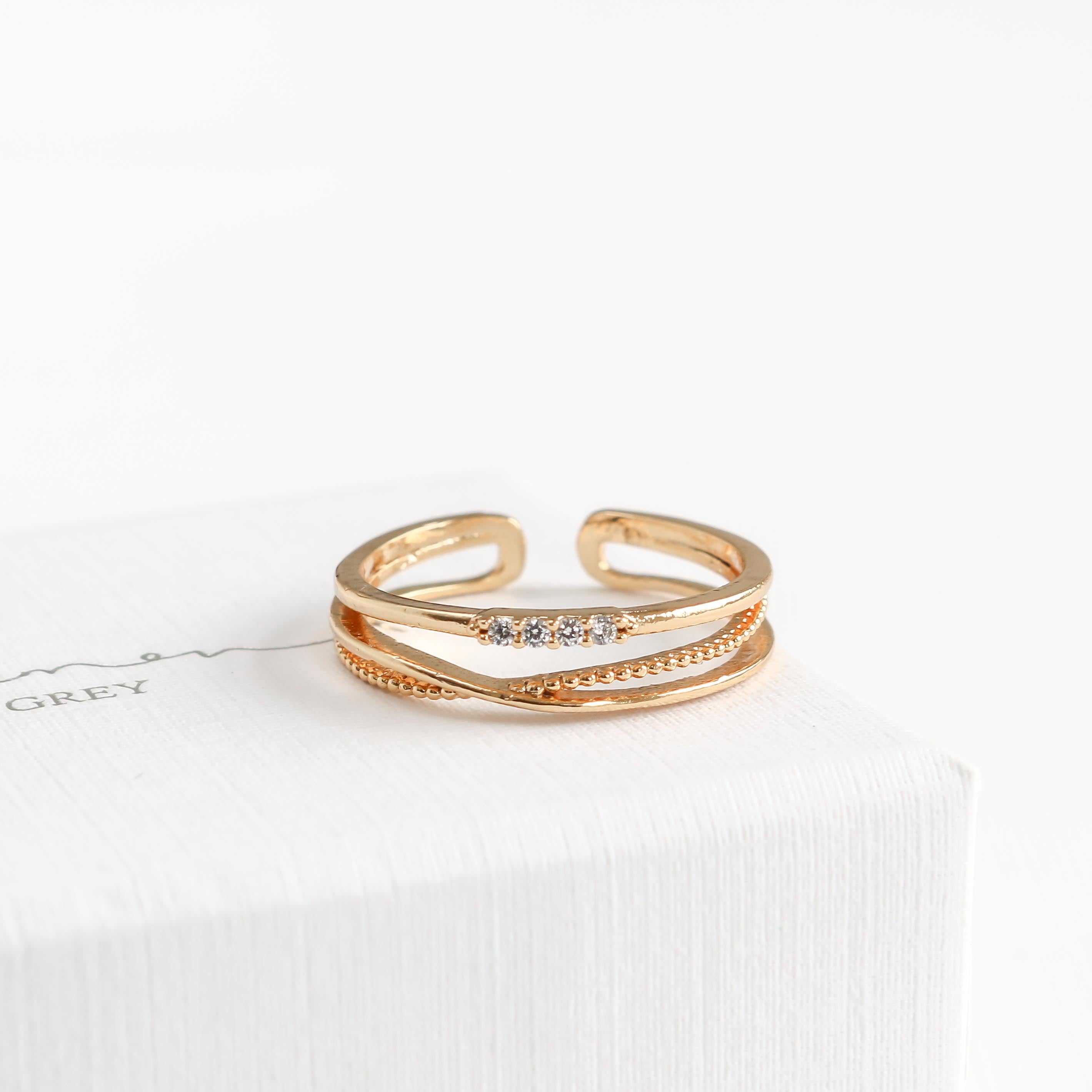 Introducing the Phoebe Line Ring - This stylish and affordable ring features a stunning triple ring look and four stone pave with a crossed beaded ring design.
