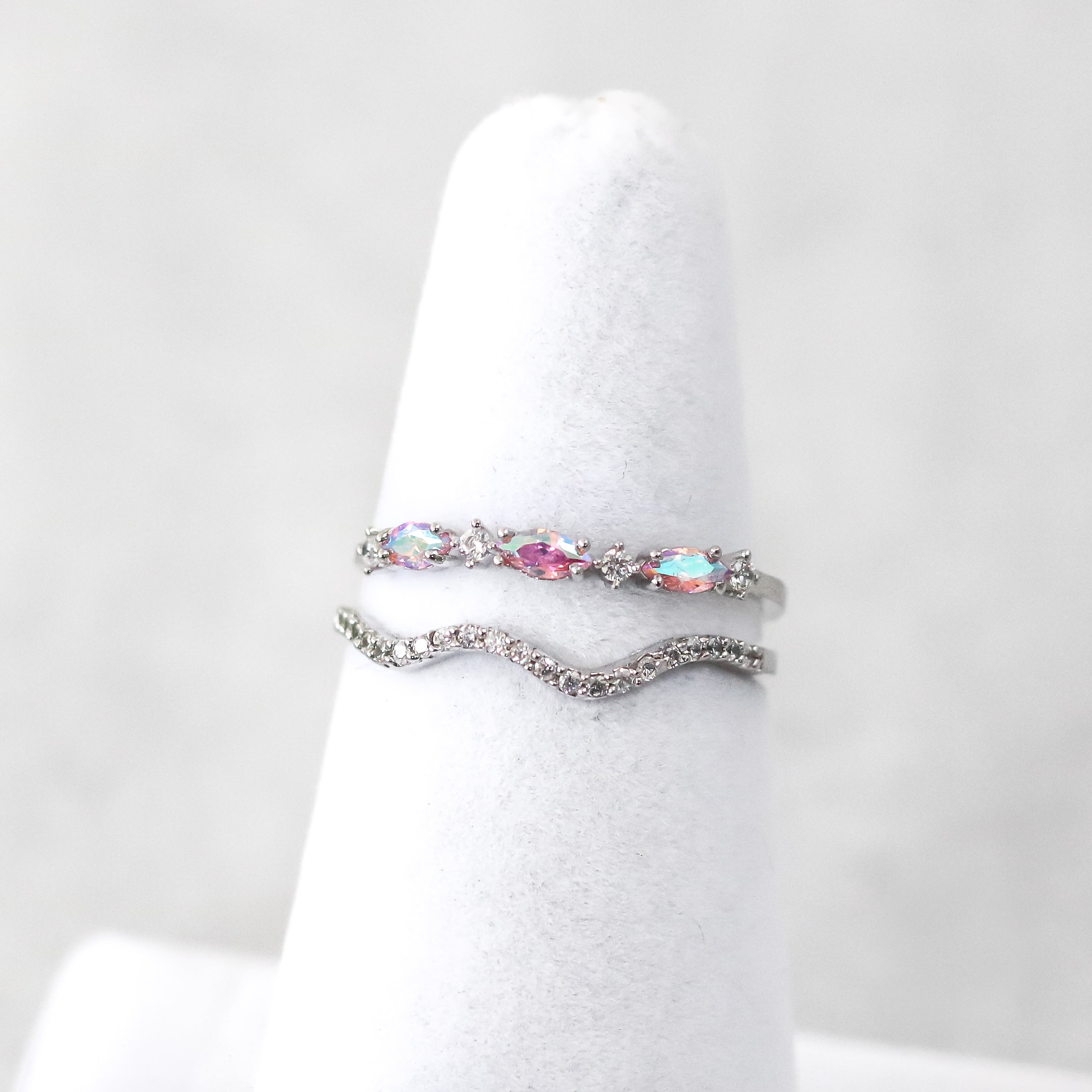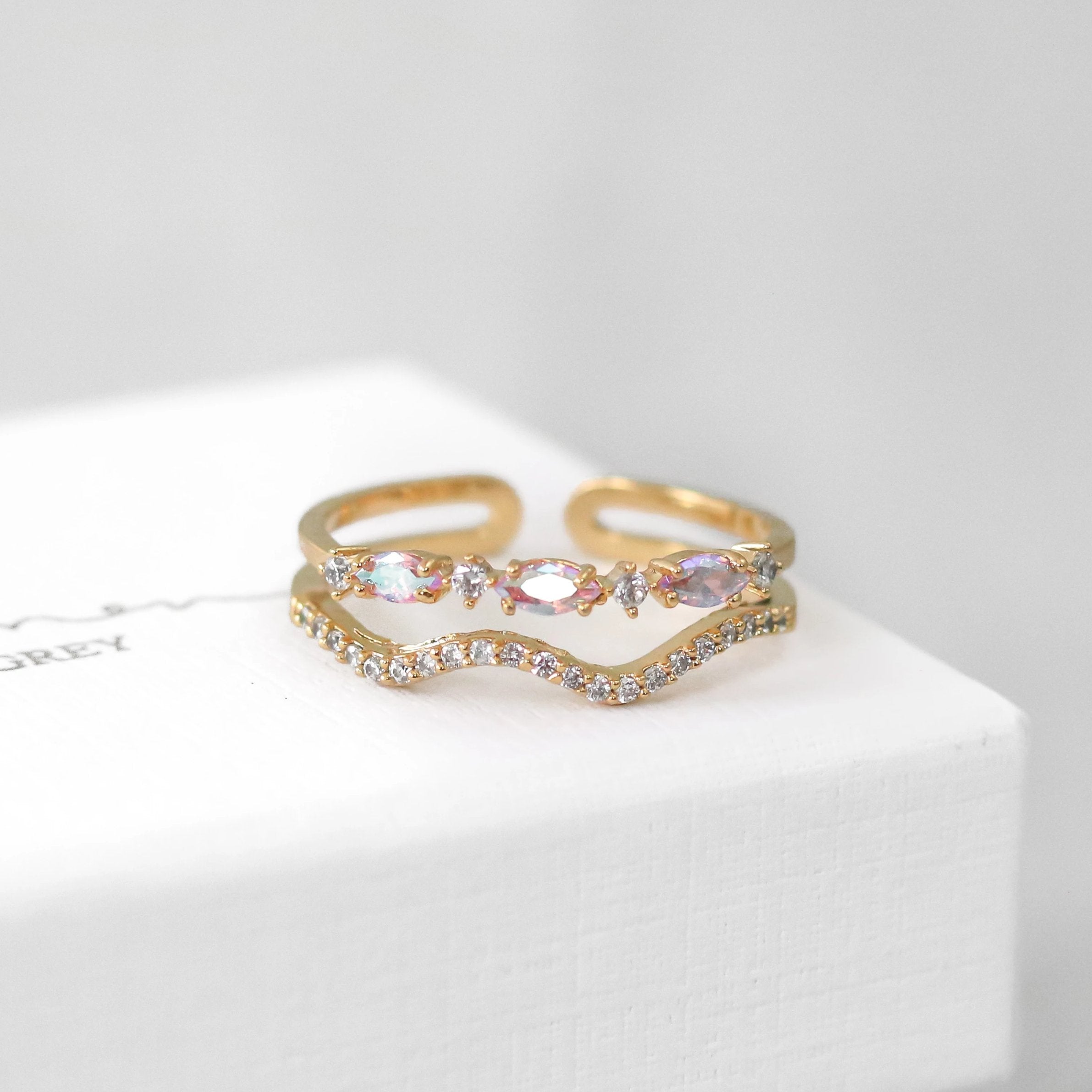The Charlotte Ring has a marquise and circle pattern of iridescent blush crystals, finished with a wavy crystal-encrusted band.