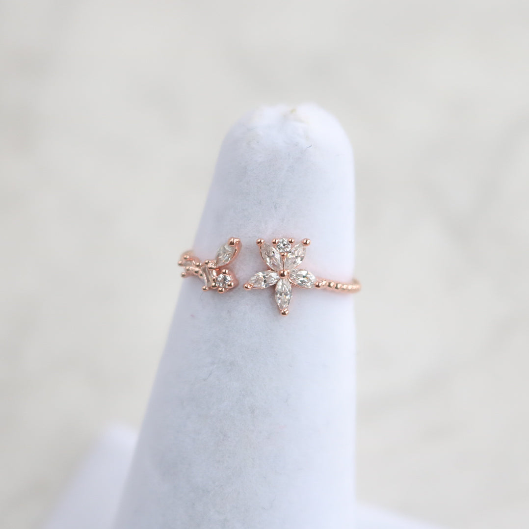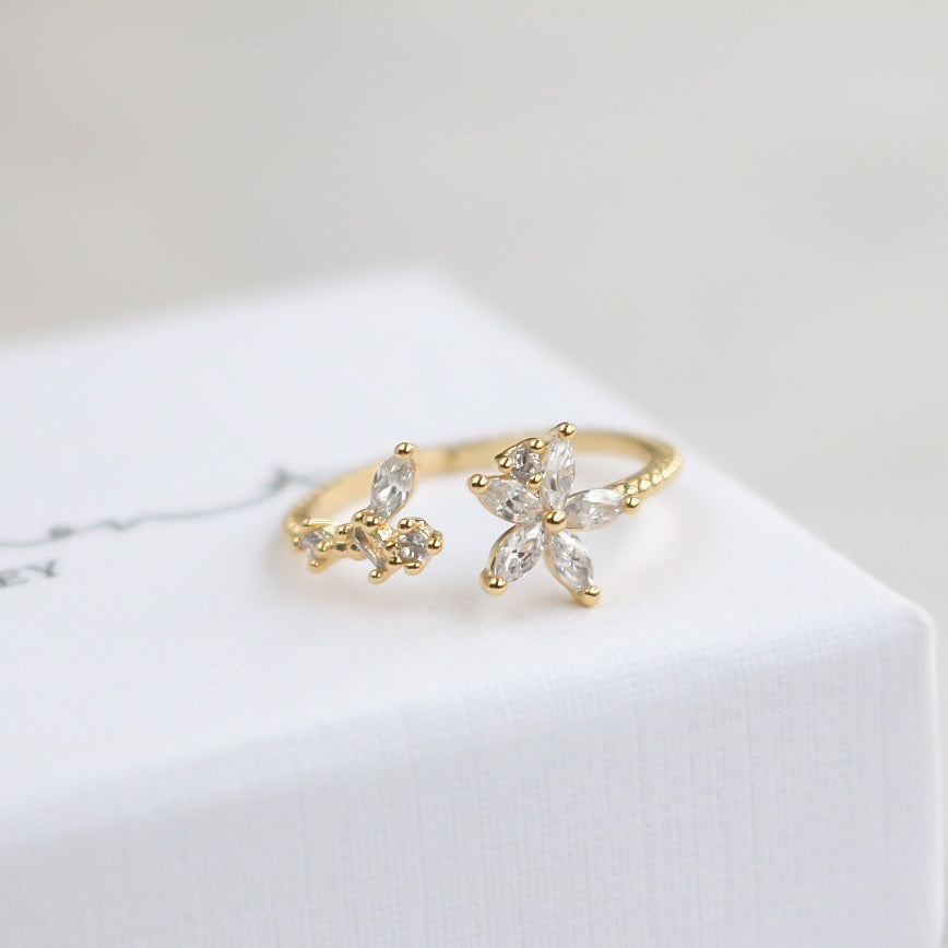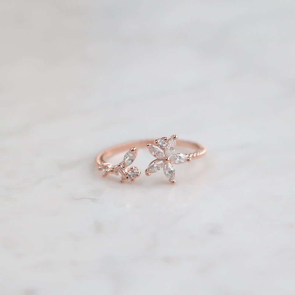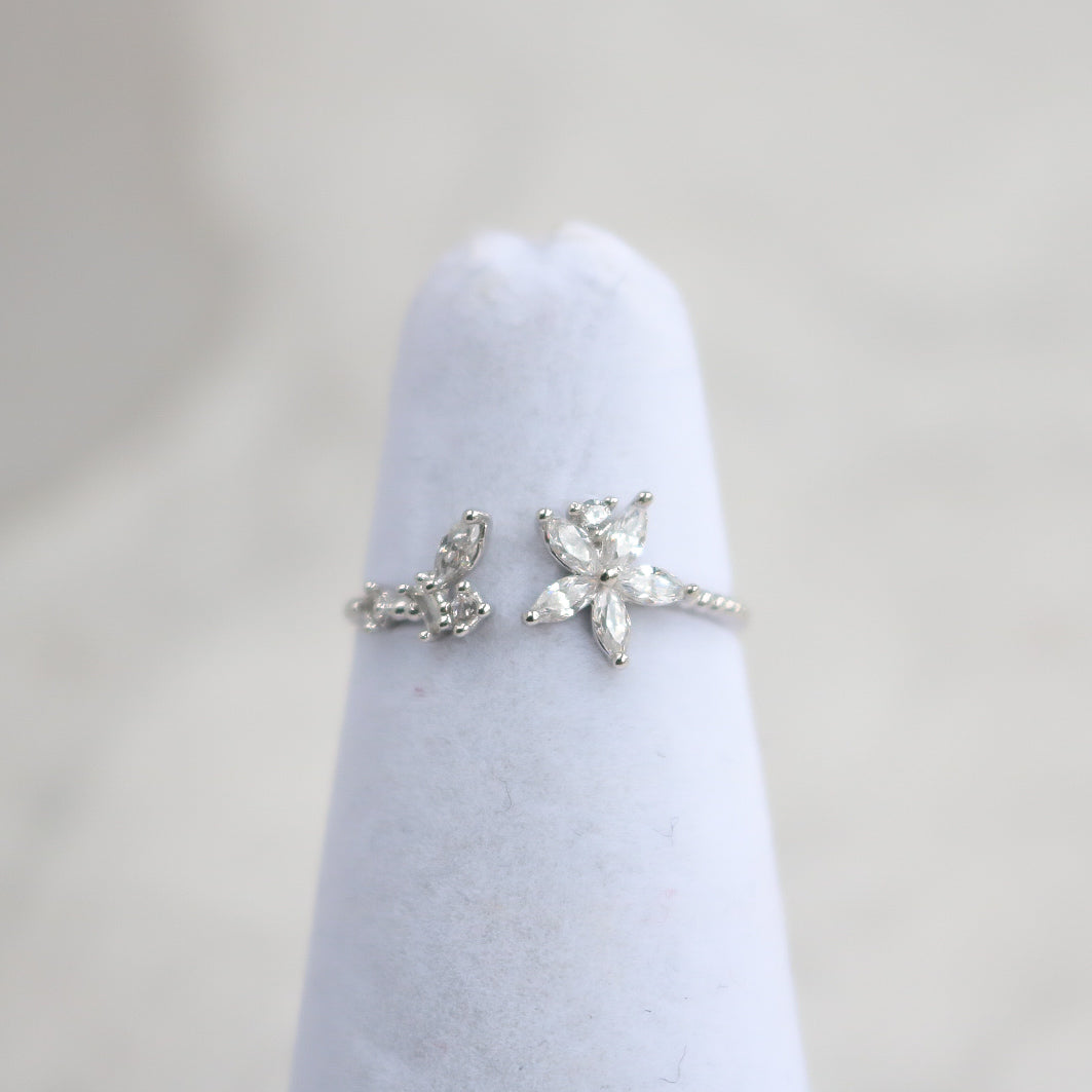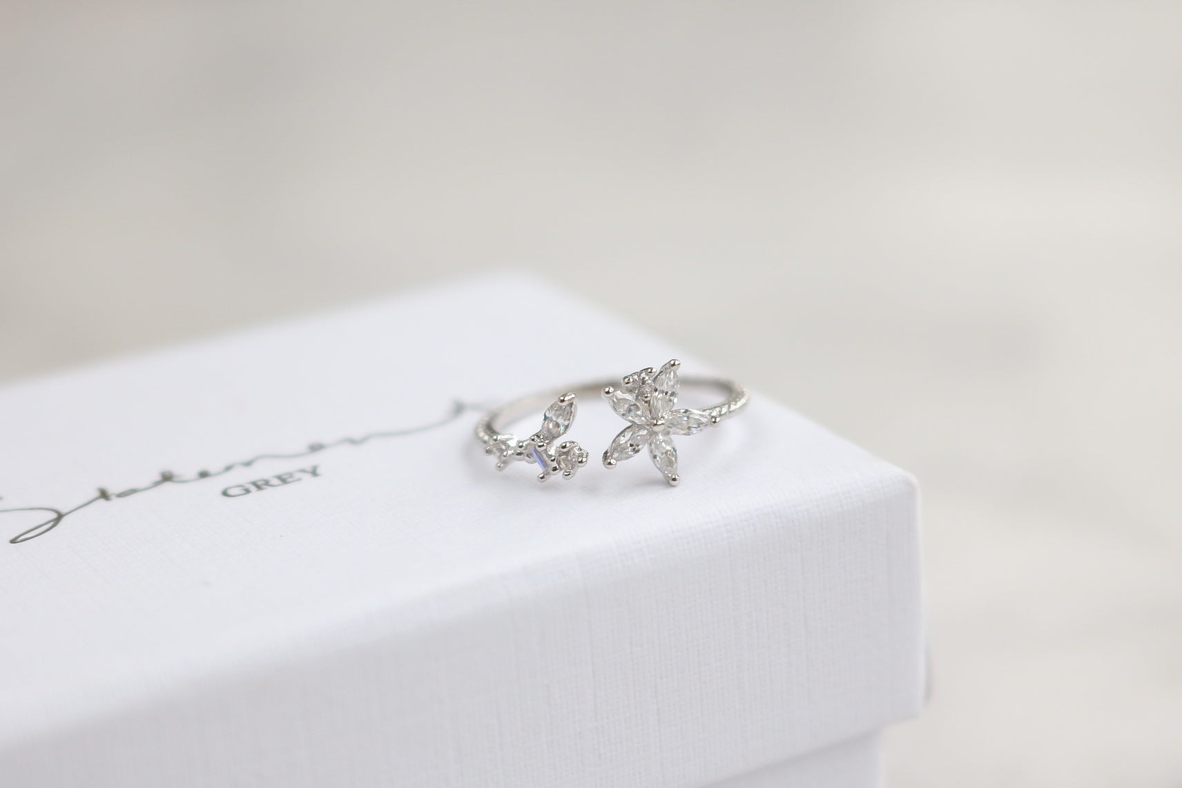 This adorable ring features a chic array of marquise, circle and emerald crystals in flower and leaf design. The Finx ring is slightly adjustable and finished with a beaded band.