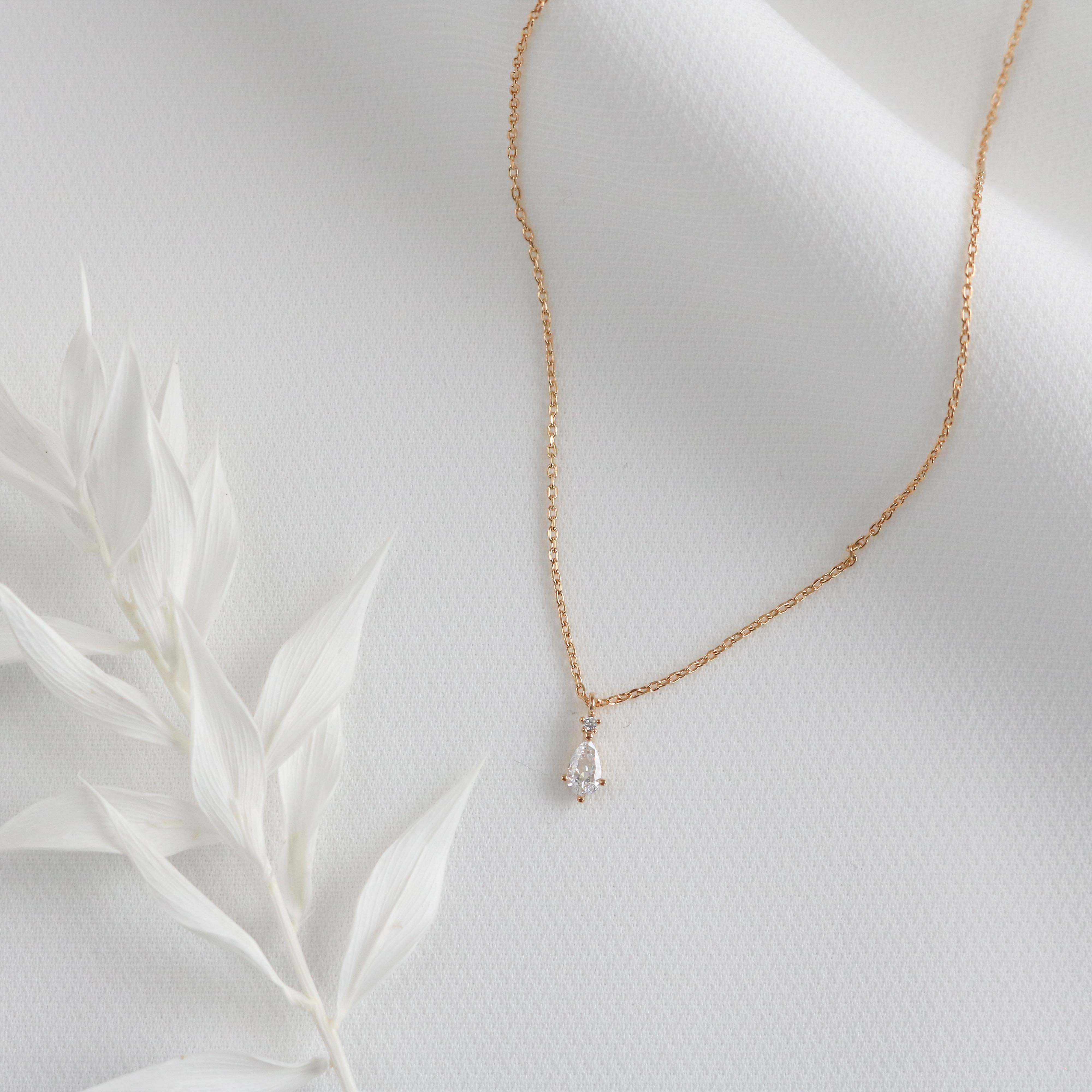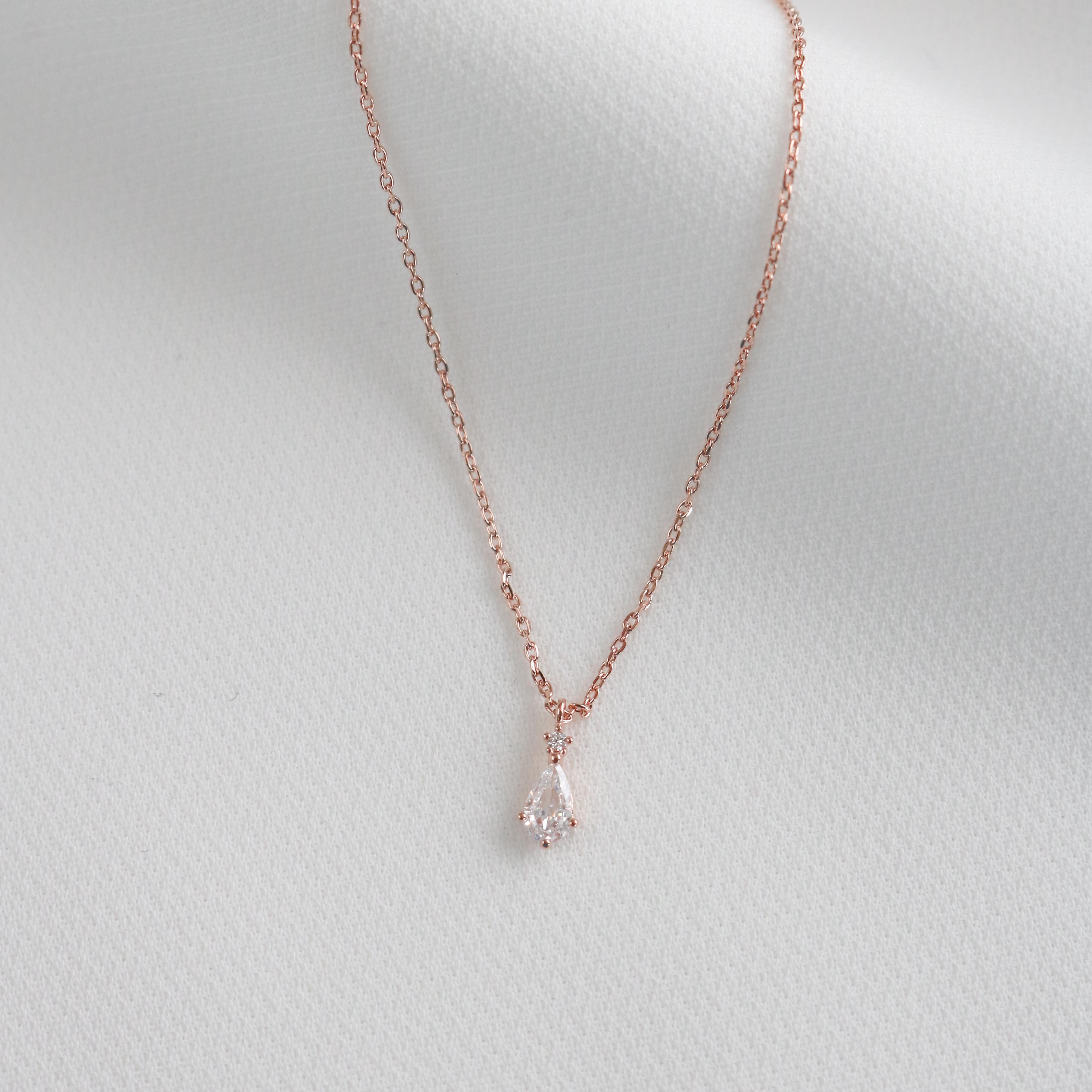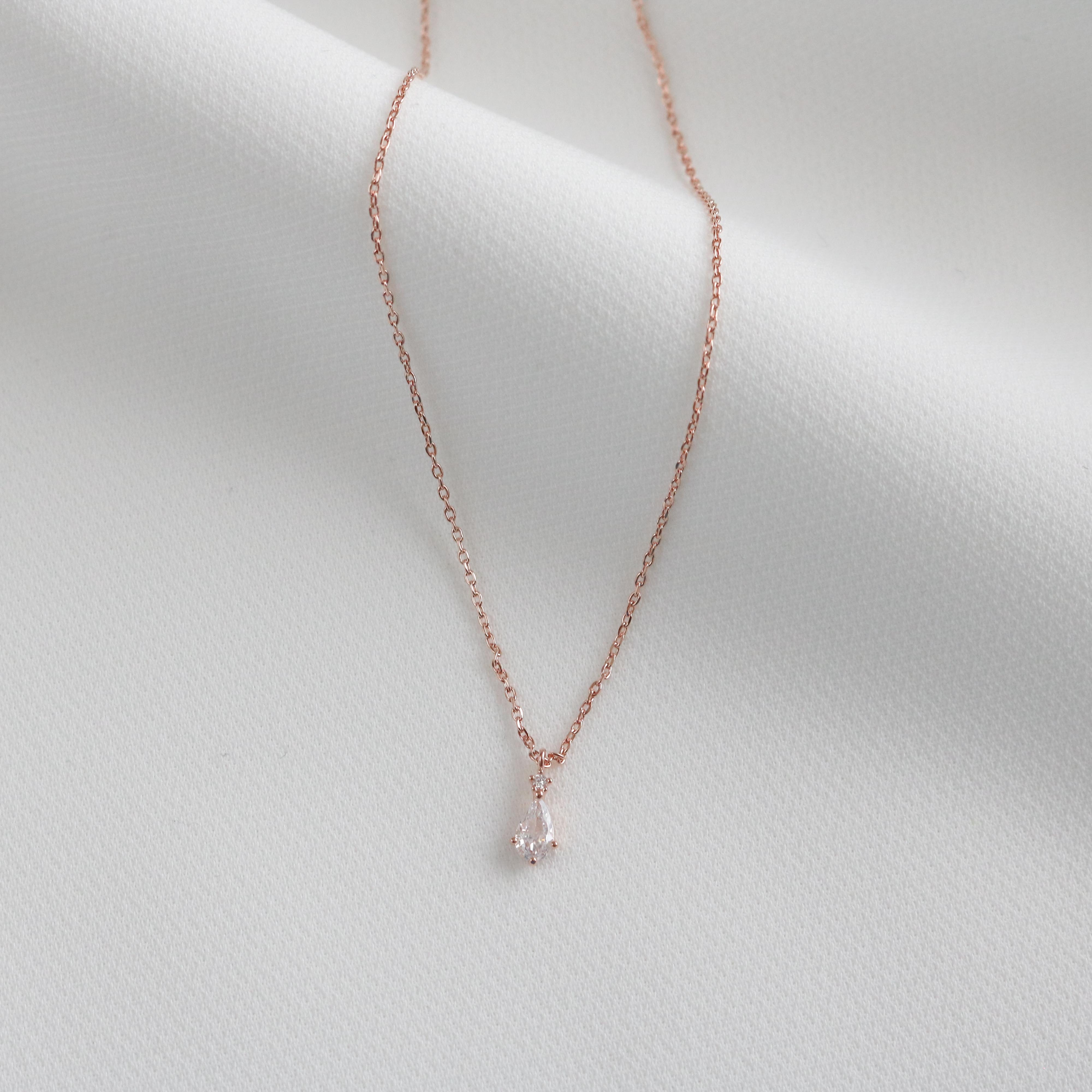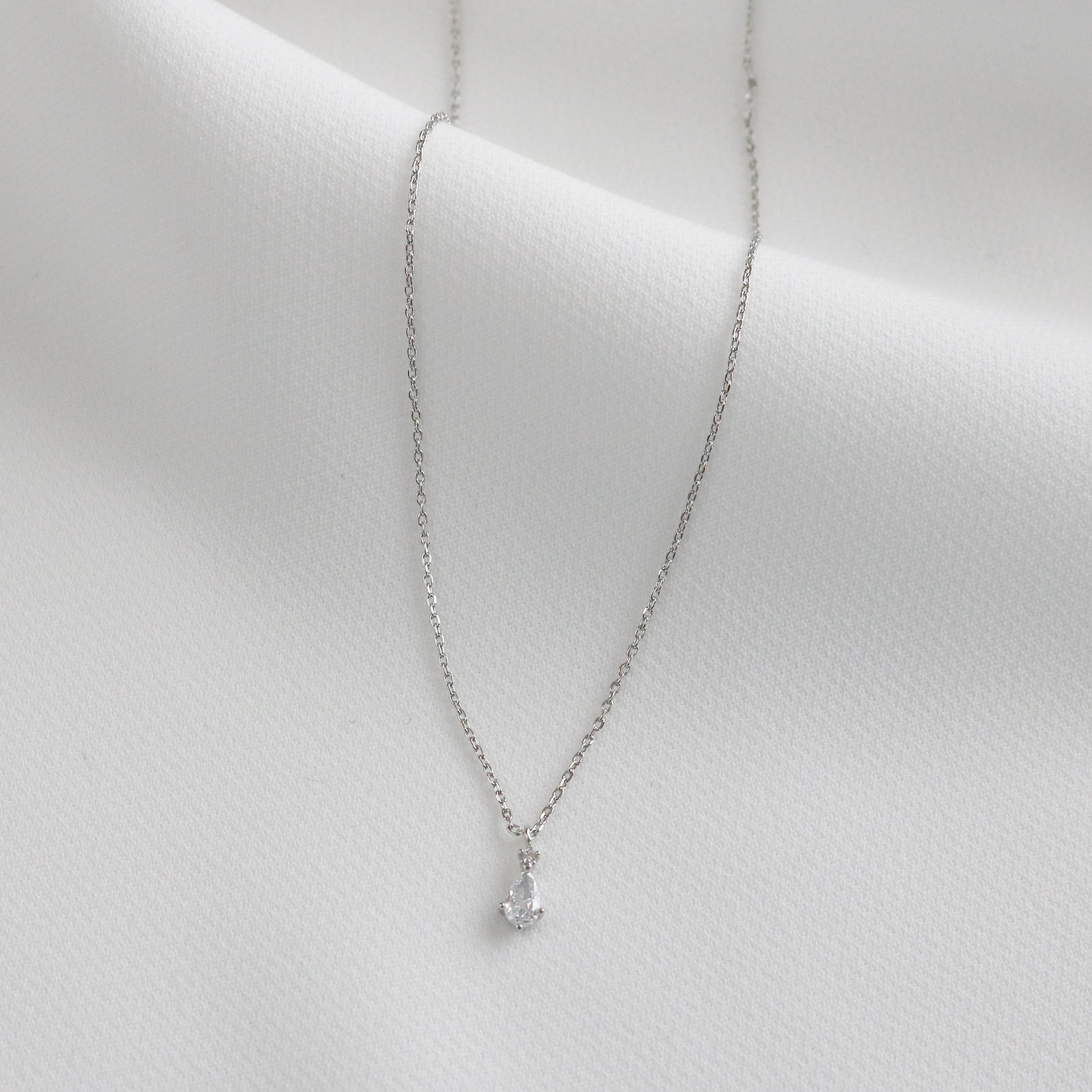 This dainty, royalesque necklace has a circle shaped crystal resting on a pear shaped crystal.
