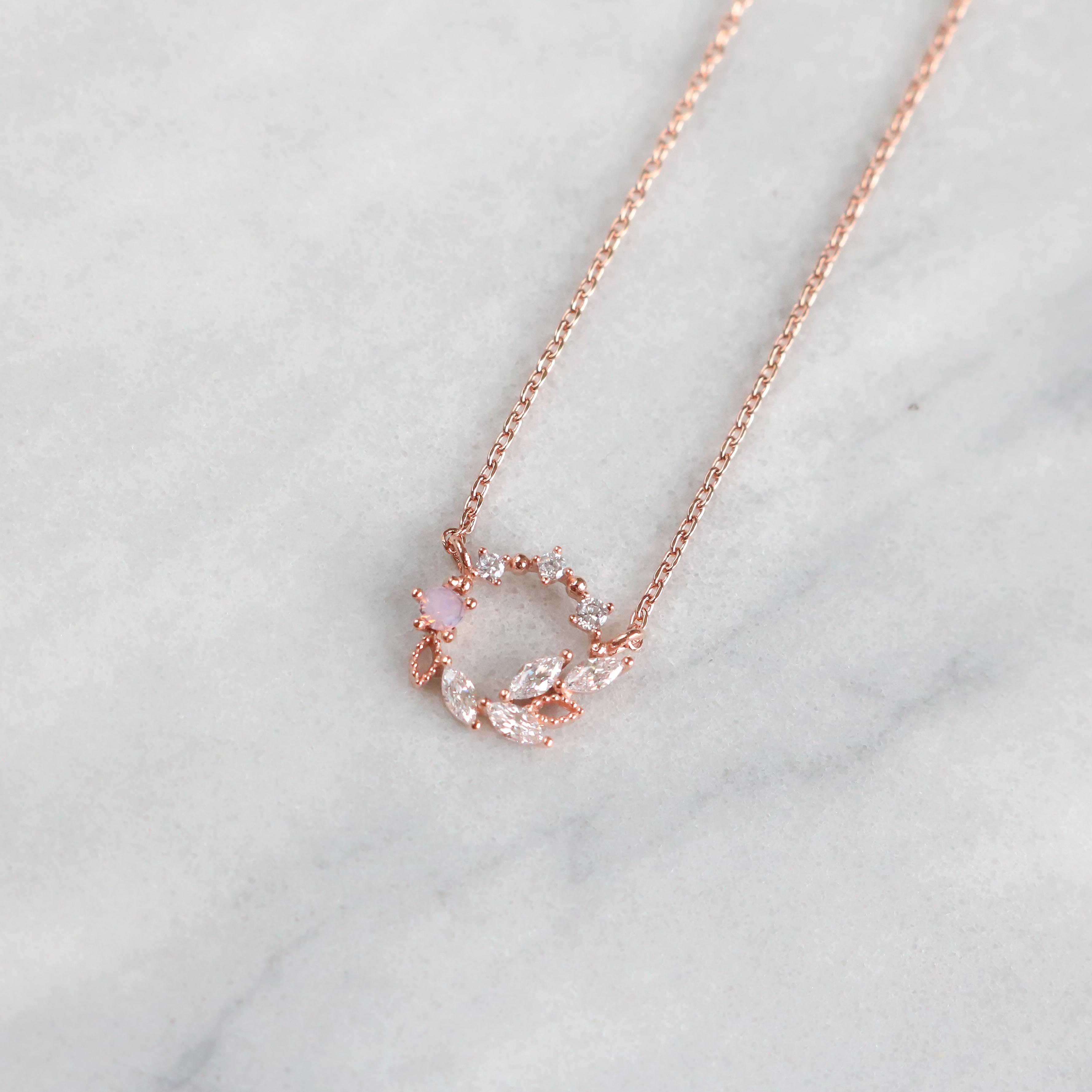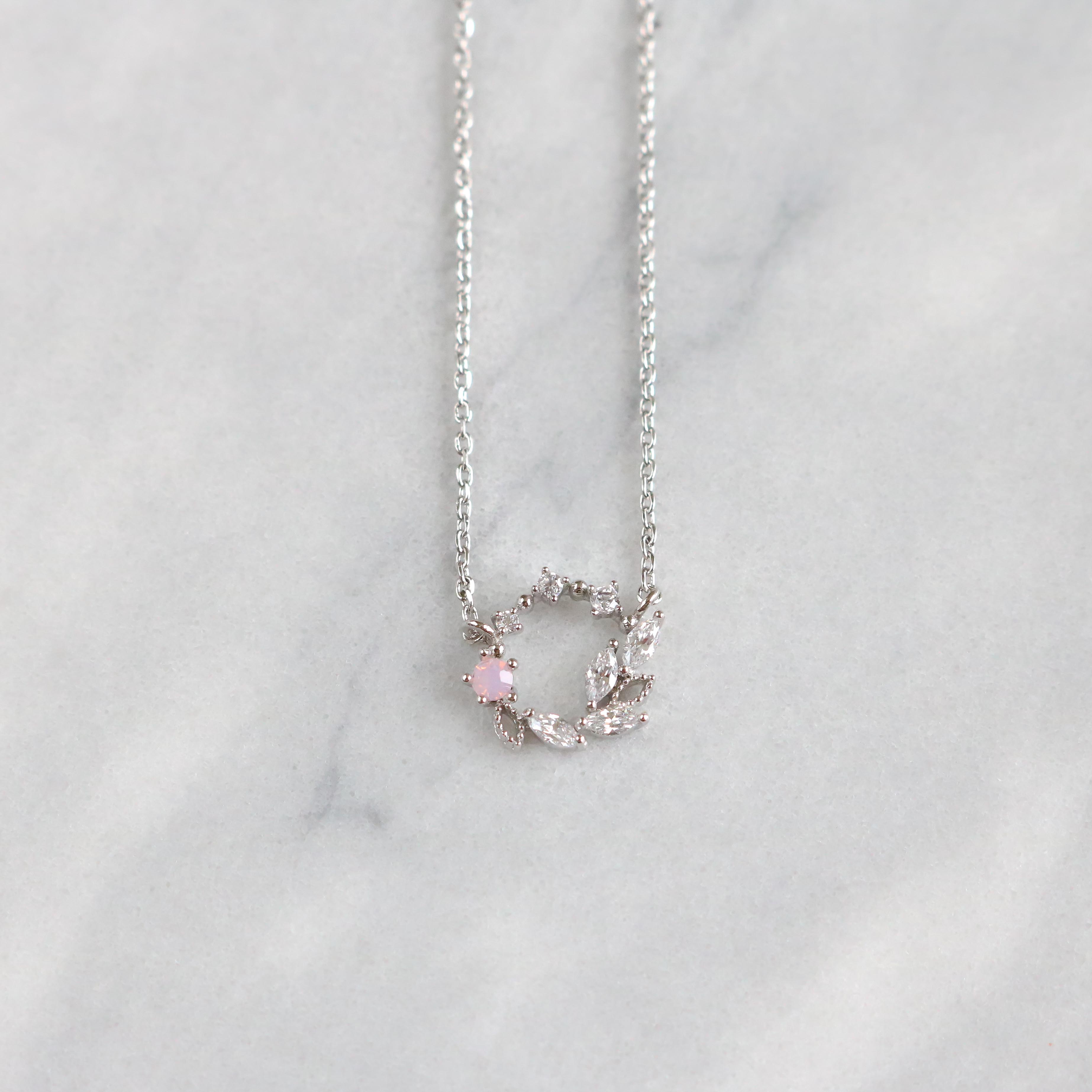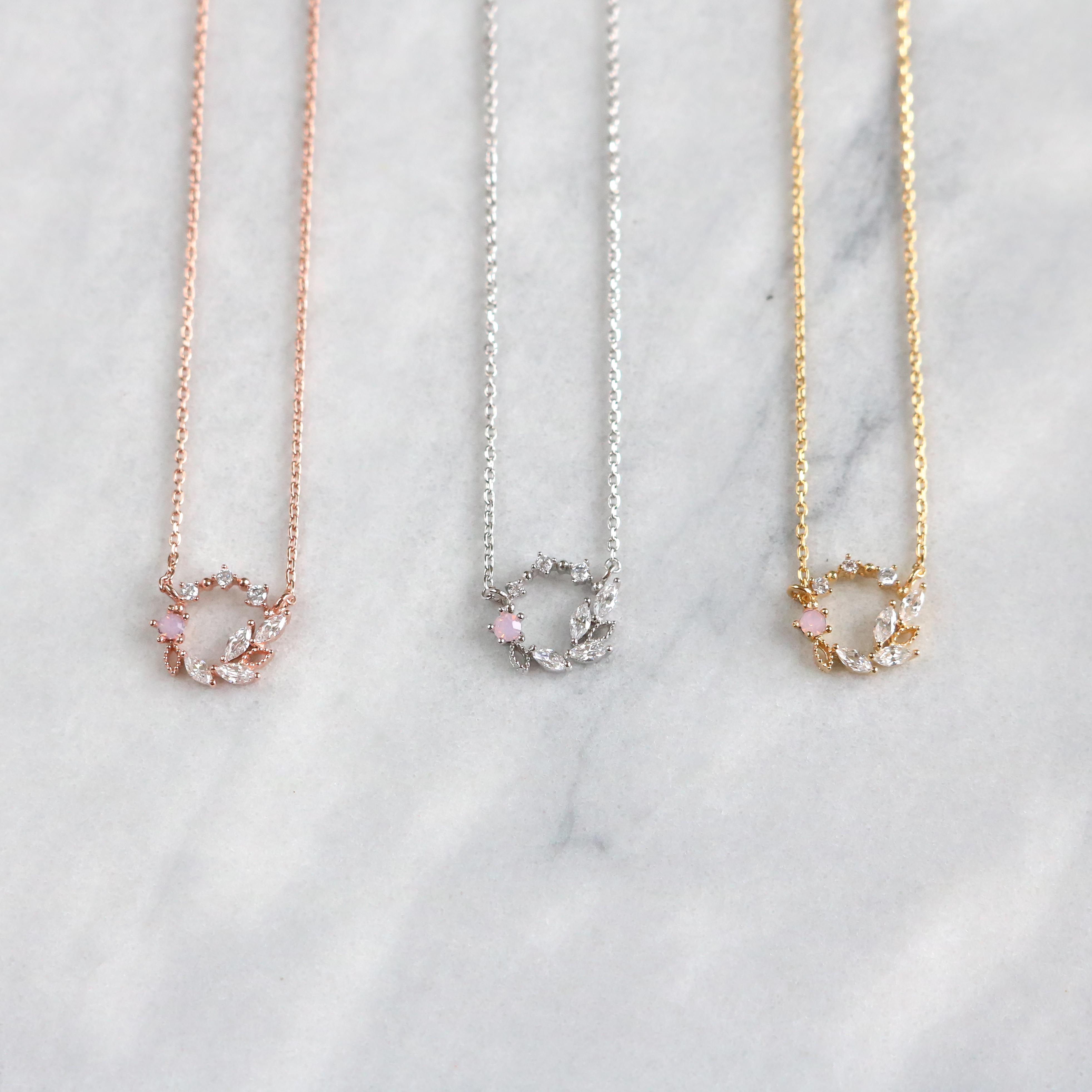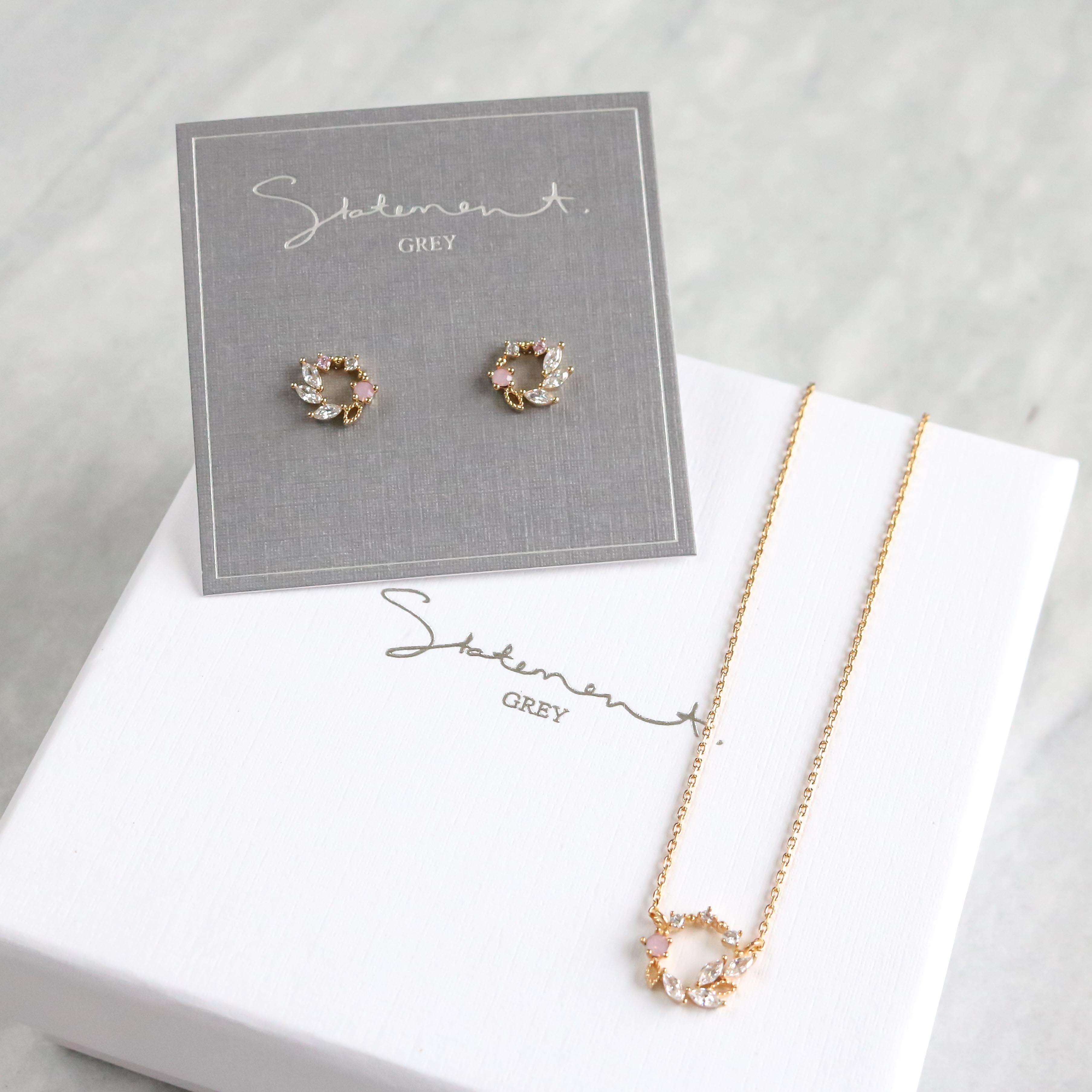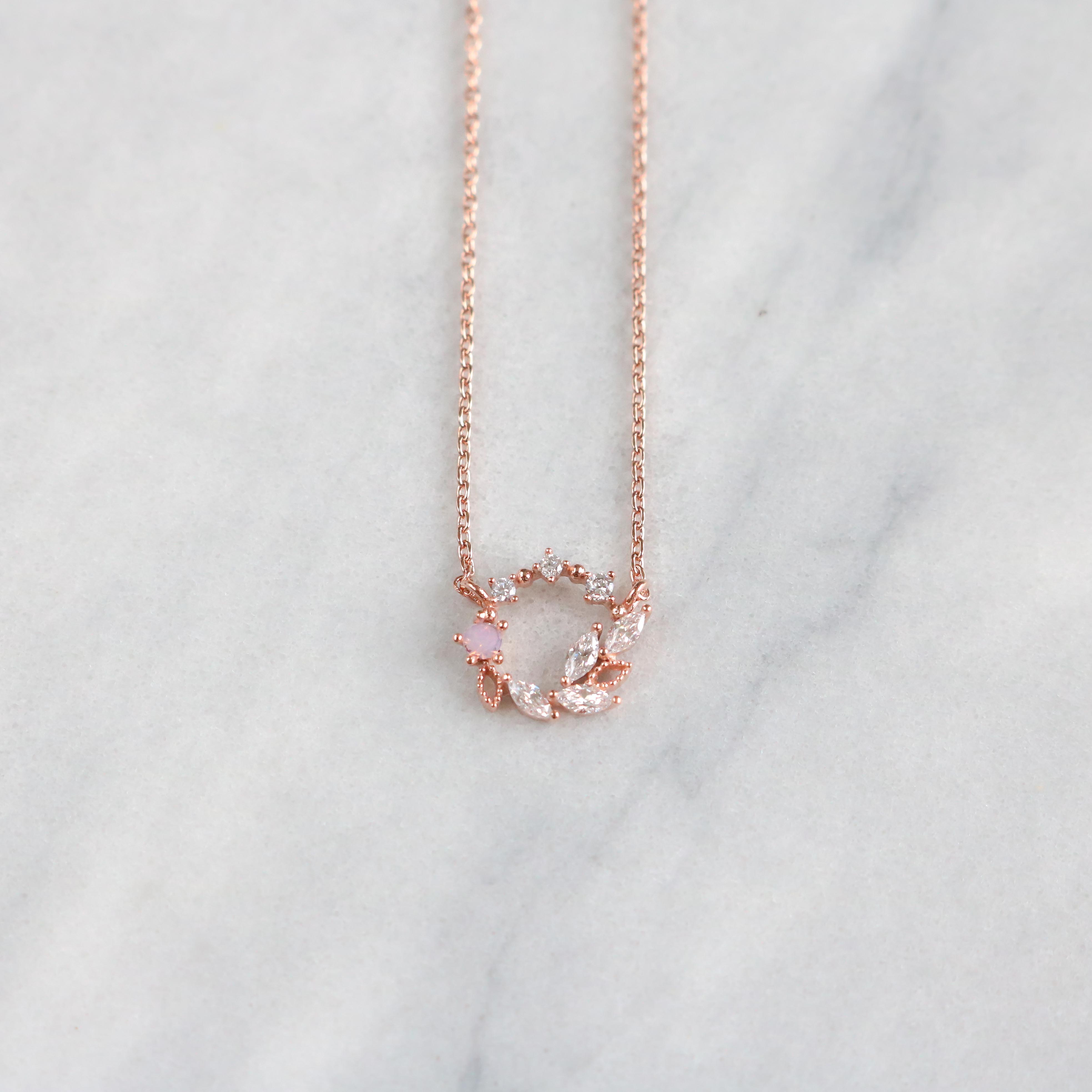 Featuring our signature leaf design, the Isadora necklace is a wreathe of pink, round and marquise crystals. Pair with our Isadora Earrings for the complete set.