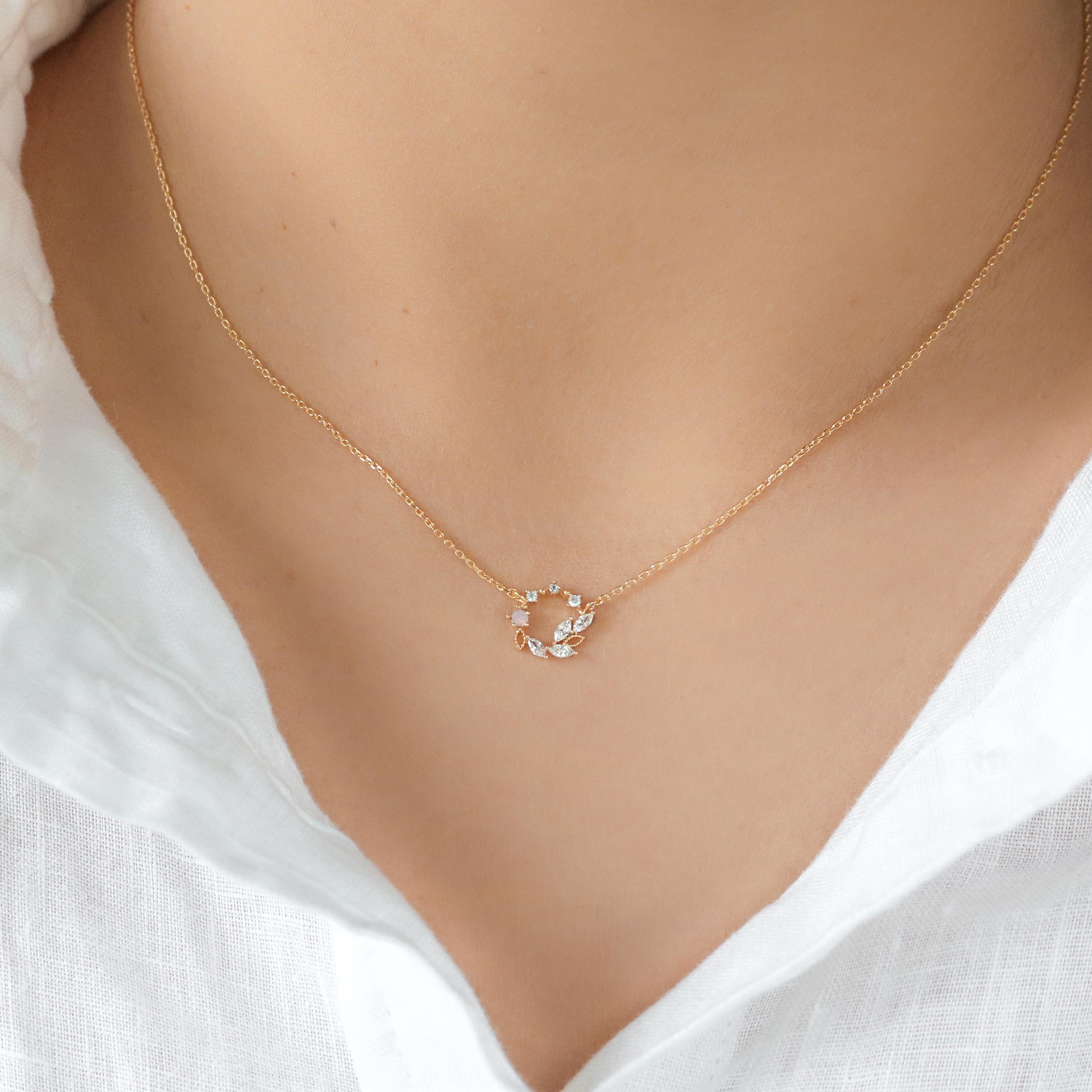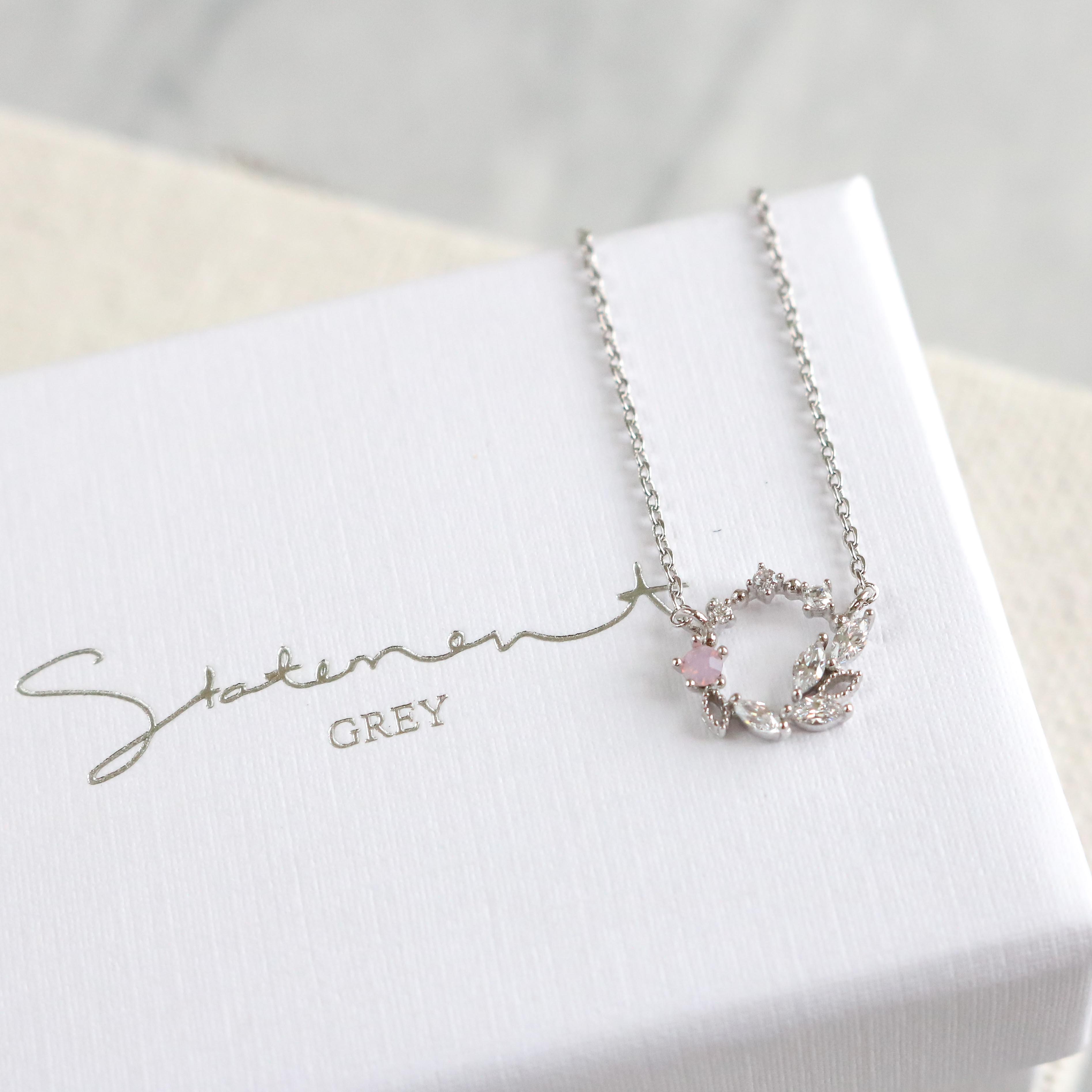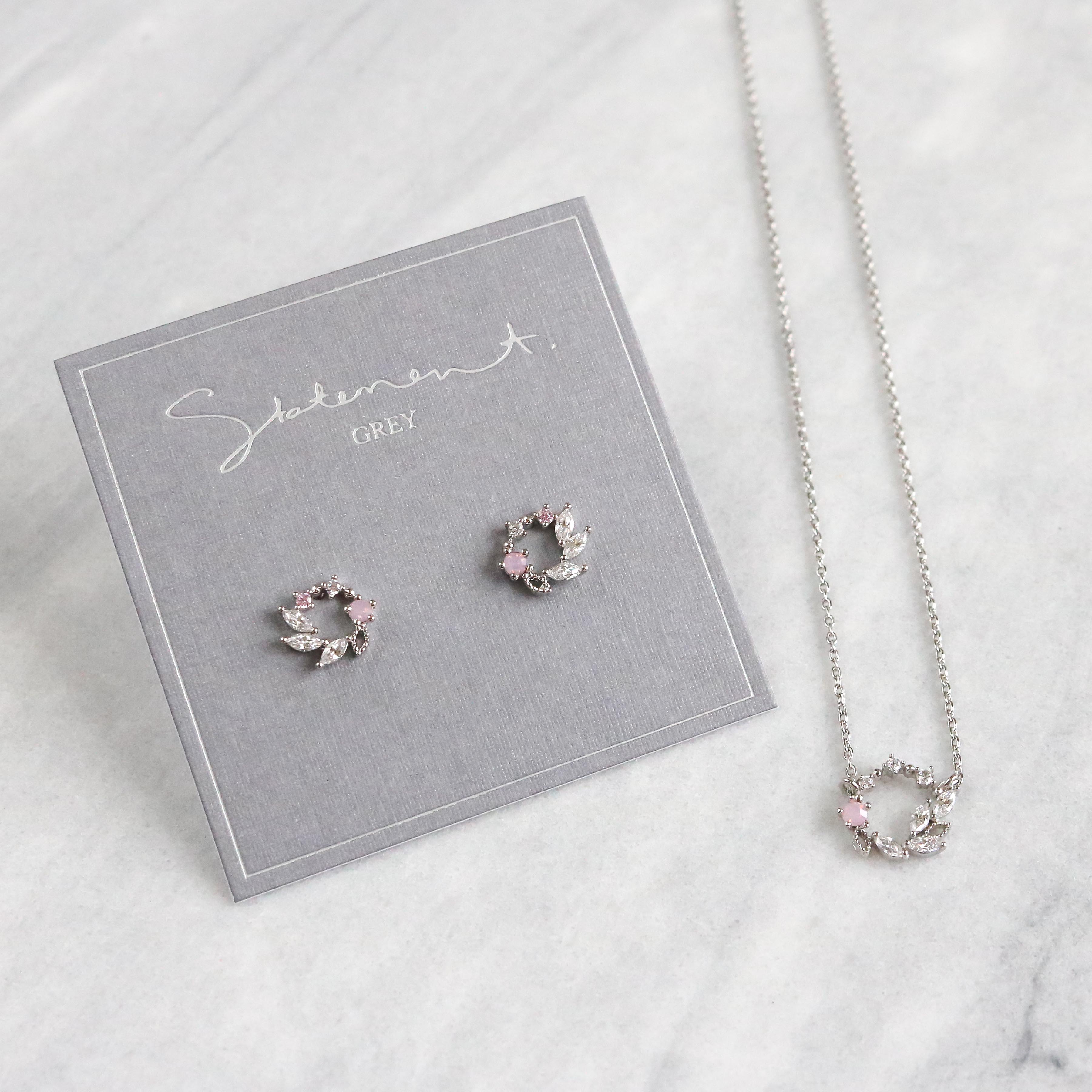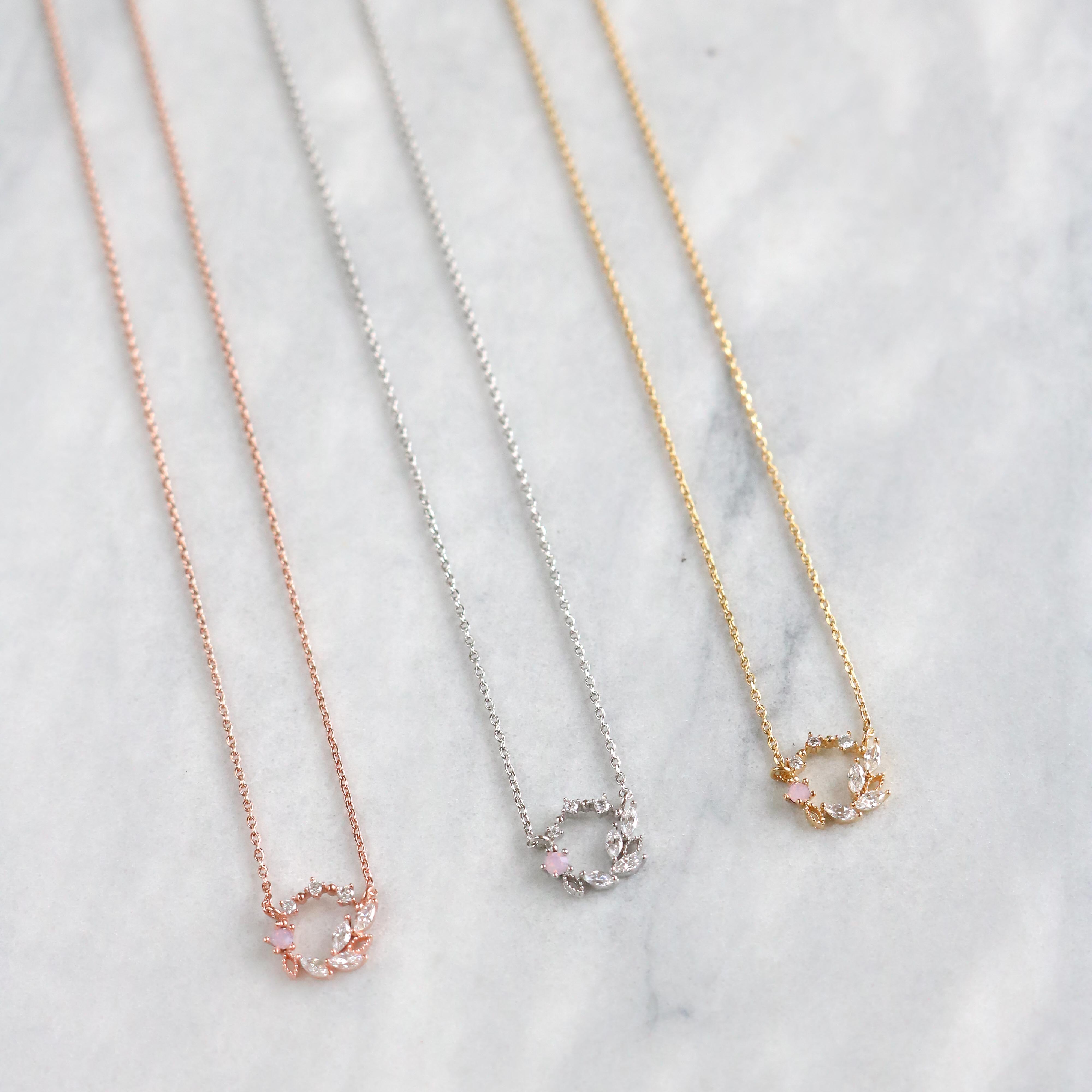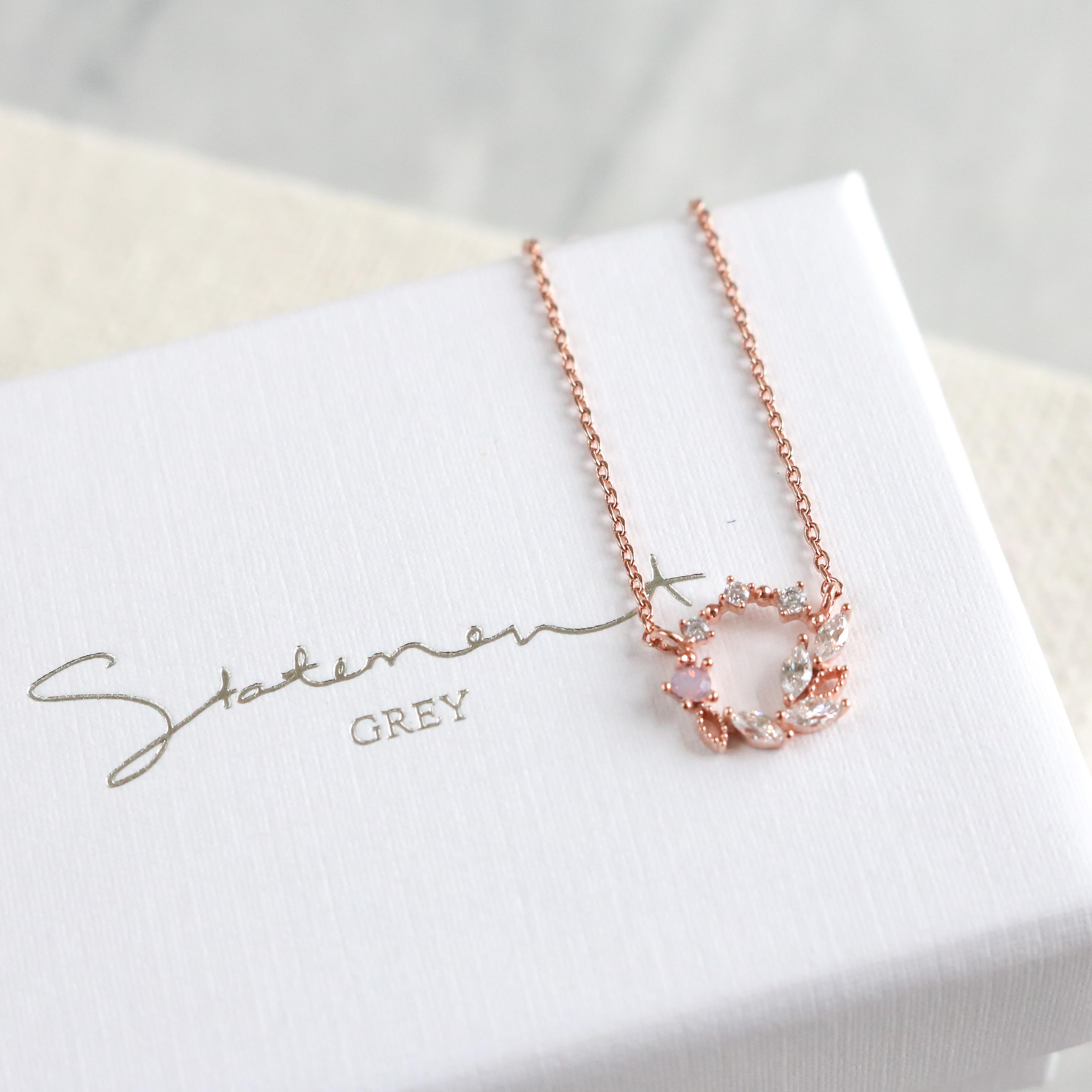 Featuring our signature leaf design, the Isadora necklace is a wreathe of pink, round and marquise crystals. Pair with our Isadora Earrings for the complete set.
