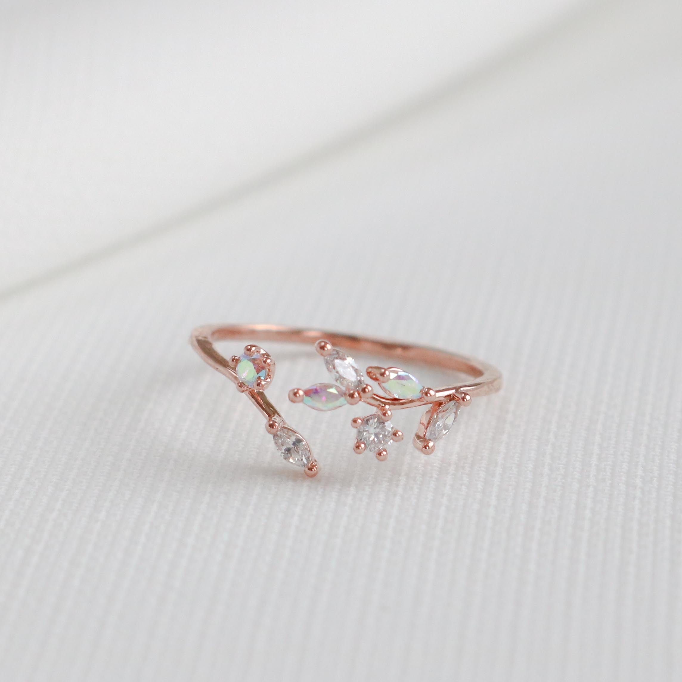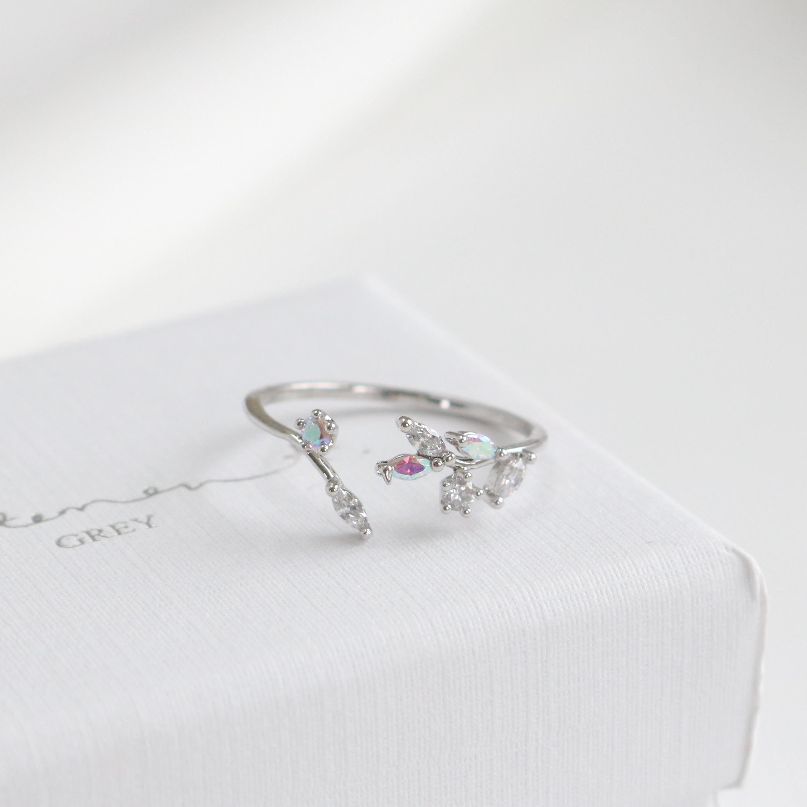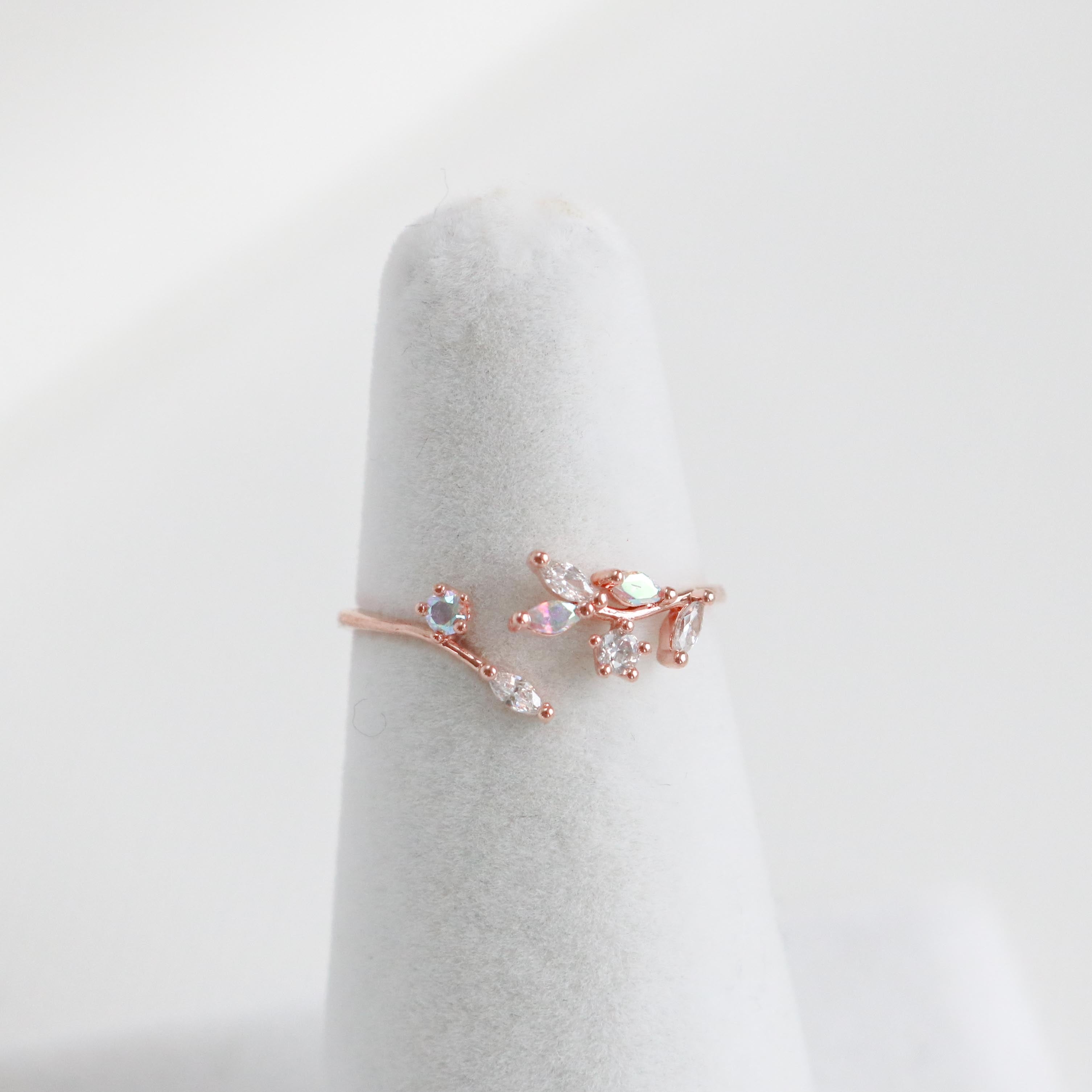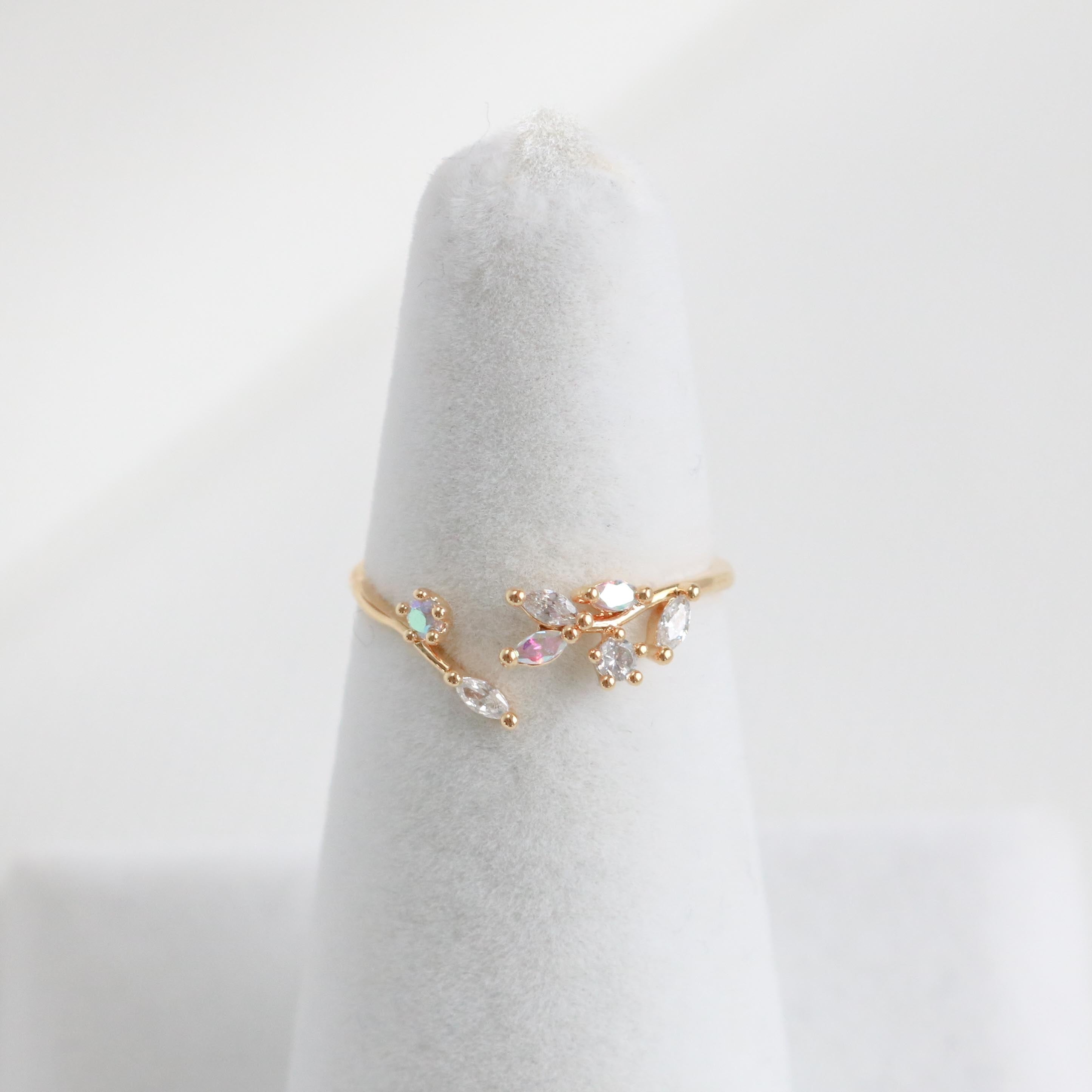 Simple and charming, the Melun ring features marquise and circular crystals resembling a leaf branch. This adjustable ring comes in two different sizes to fit your glamour needs. Makes a stunning pinky ring for that feminine touch.