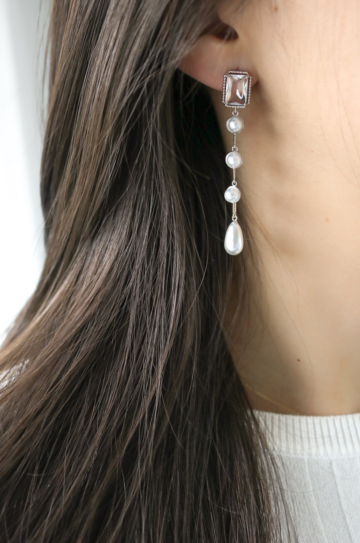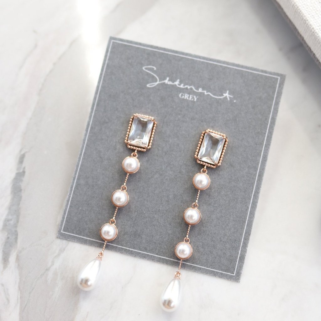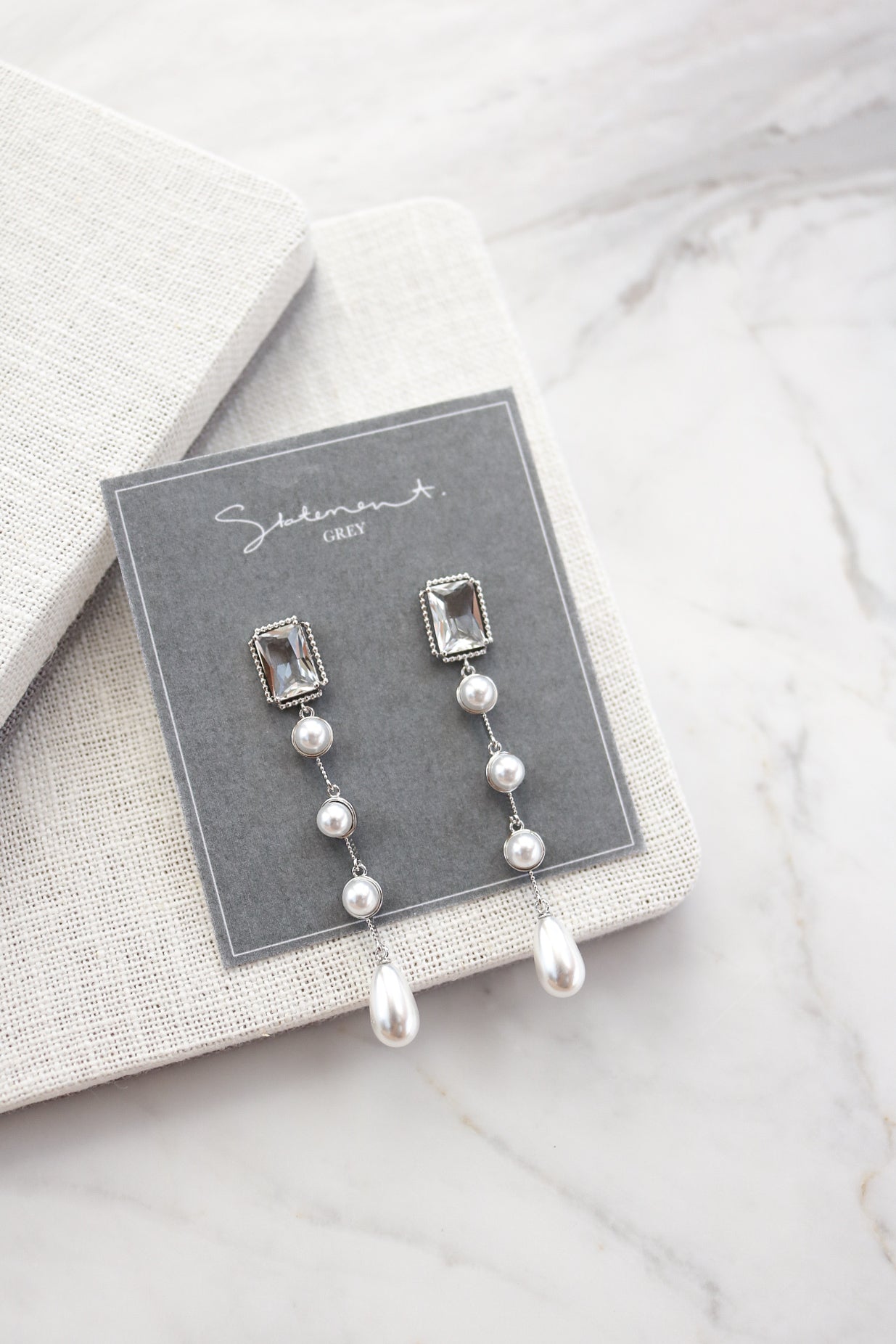 The Freesia earrings feature a princess cut crystal, embellished with three round faux pearls and a pear shaped pearl. The pearls are individually attached so they are comfortable and sway with you as you move around, adding a dashing, charming accent to your look on your night out.