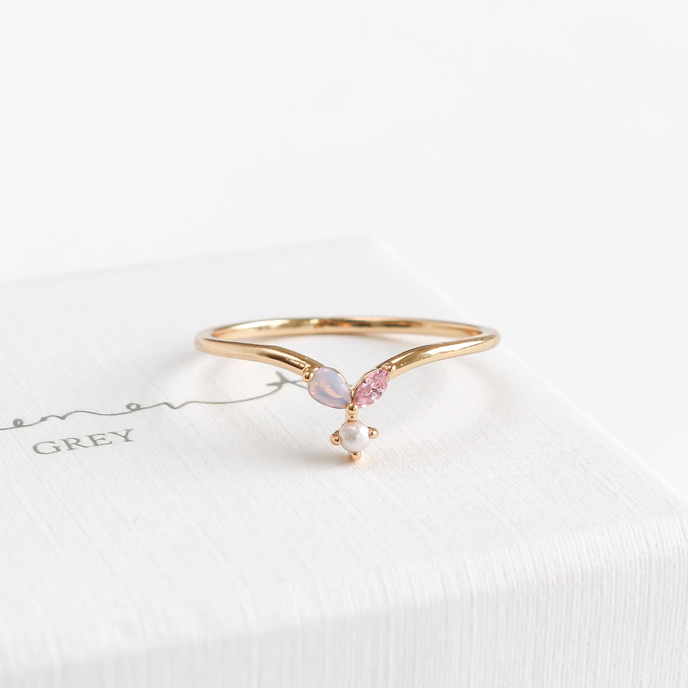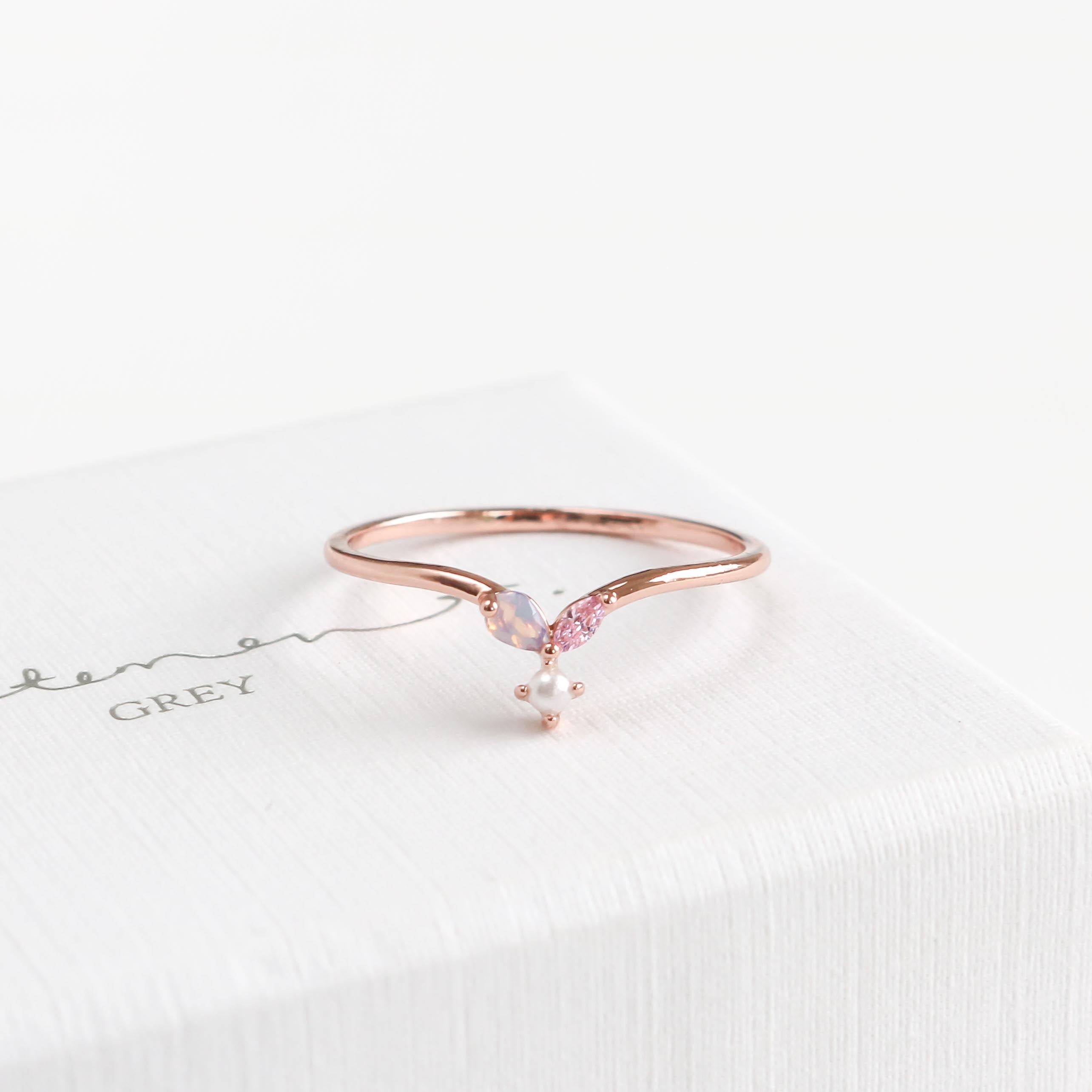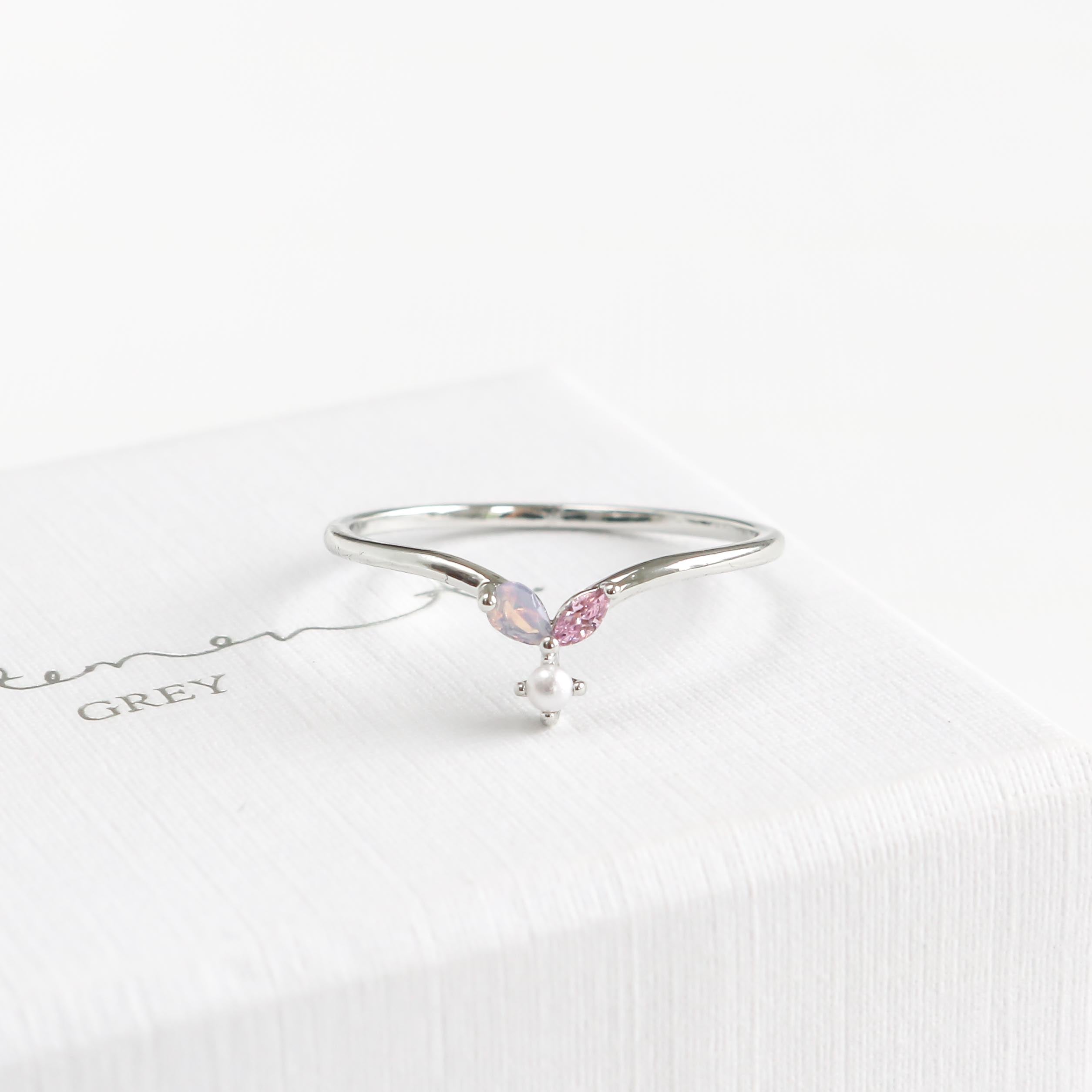 Be swept away by the Verity Ring's romantic v-shaped design, featuring a gorgeous teardrop pastel mauve stone, sparkling pink stone, and a dainty pearl accent.