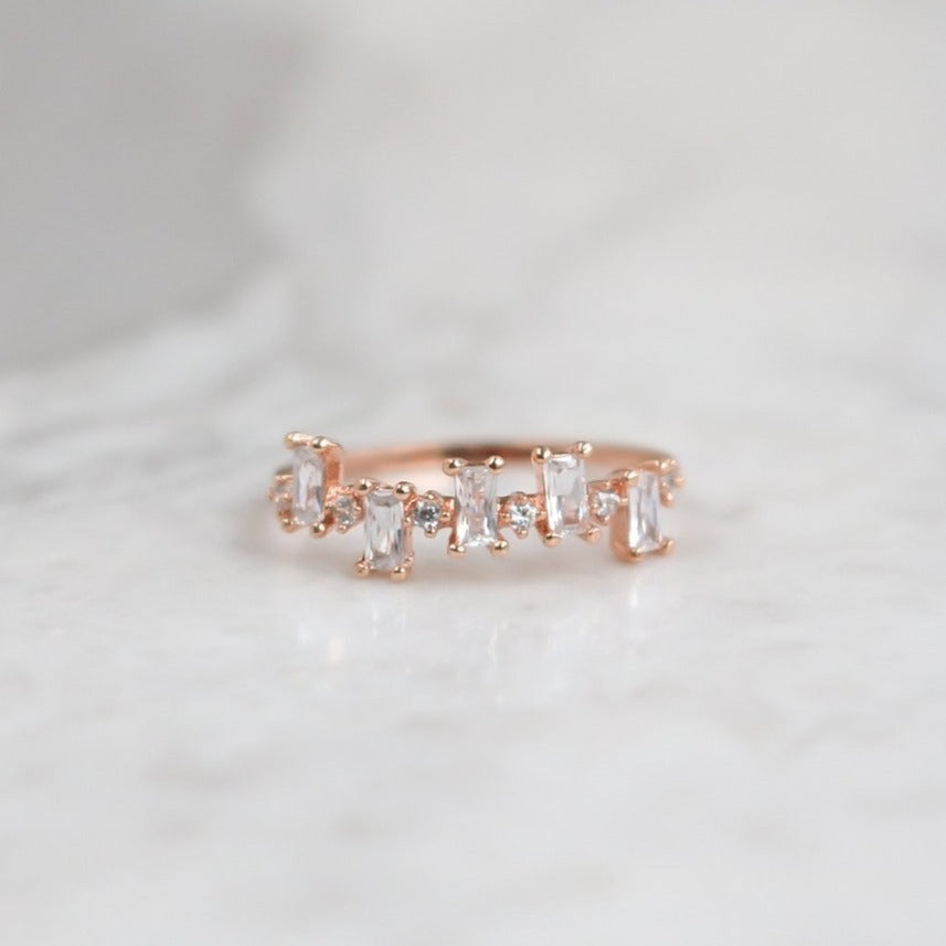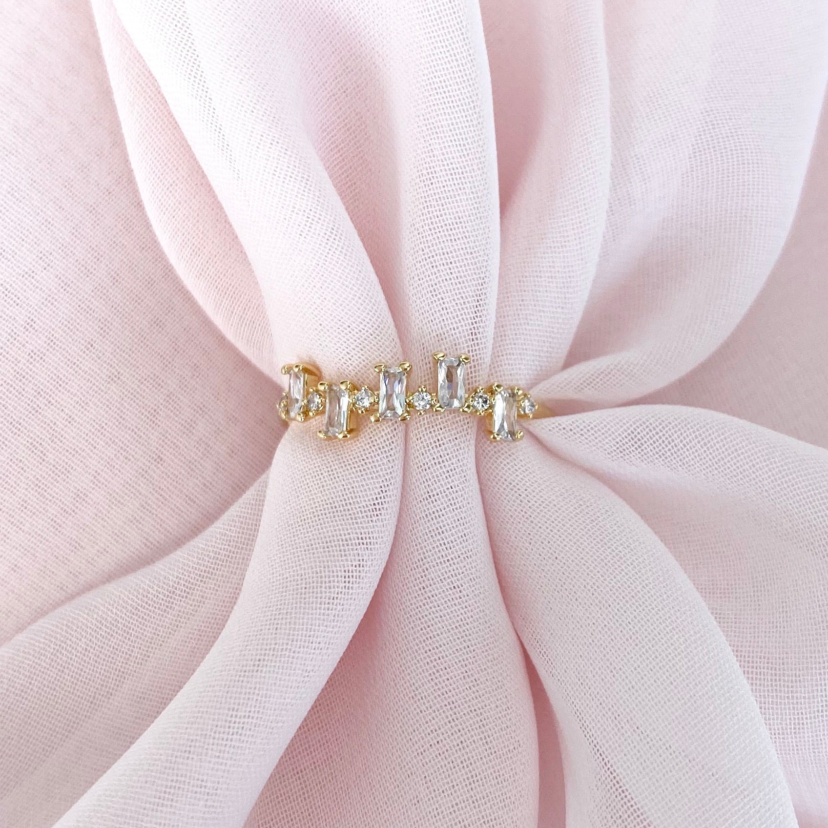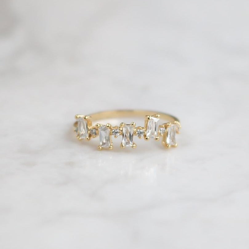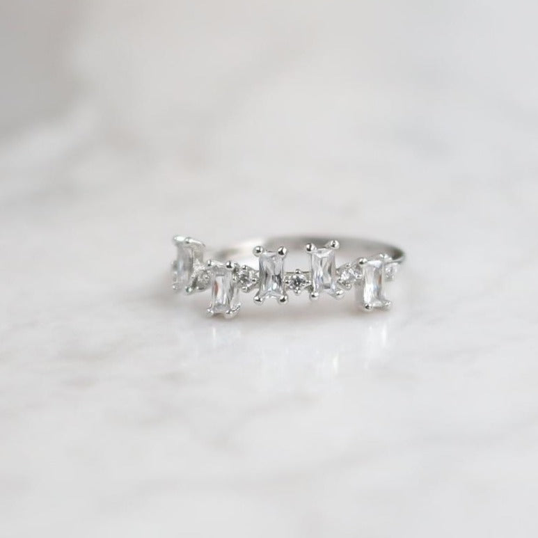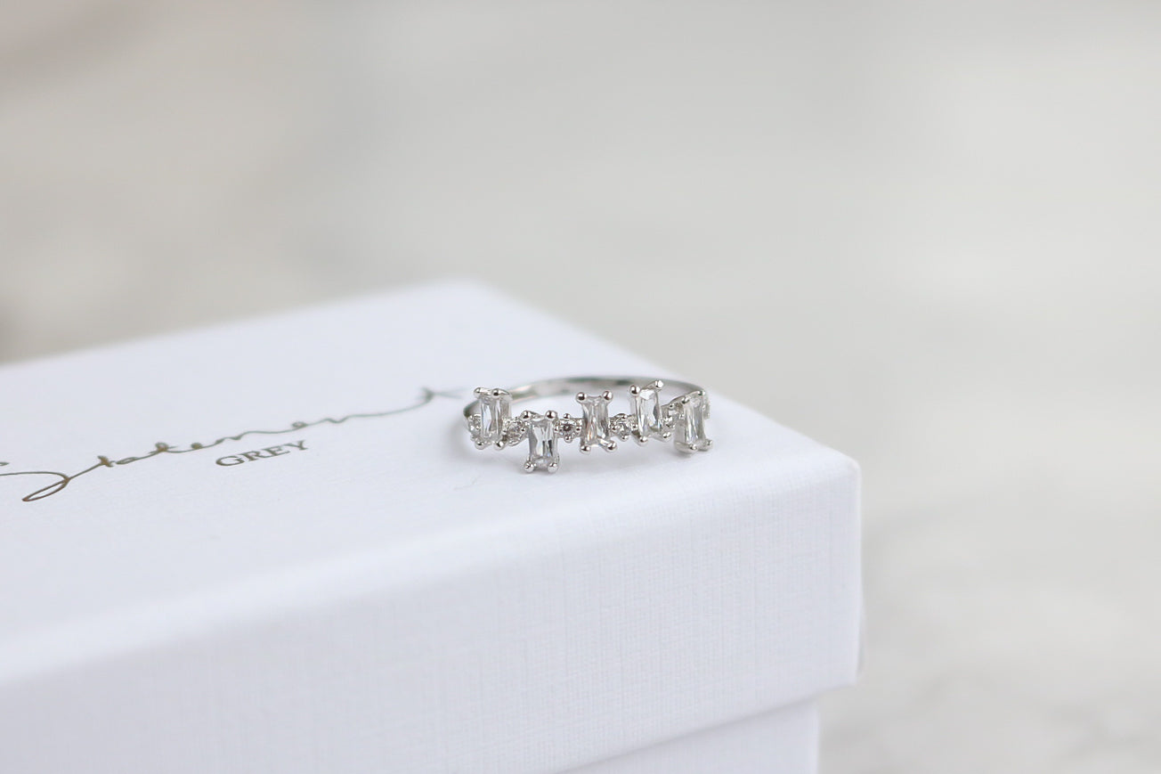 Unique and eye-catching, the Beige ring features an asymmetrical combination of emerald and round cut crystals. This charming ring is sure to have you checking out your hand all day.