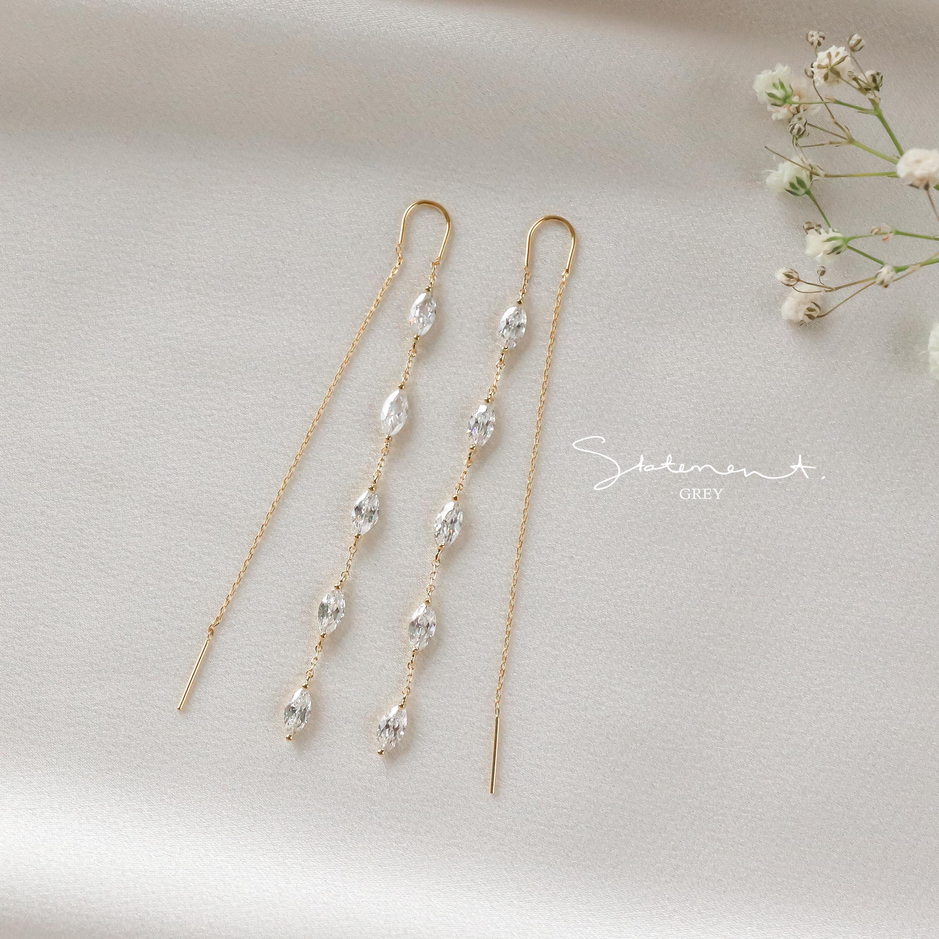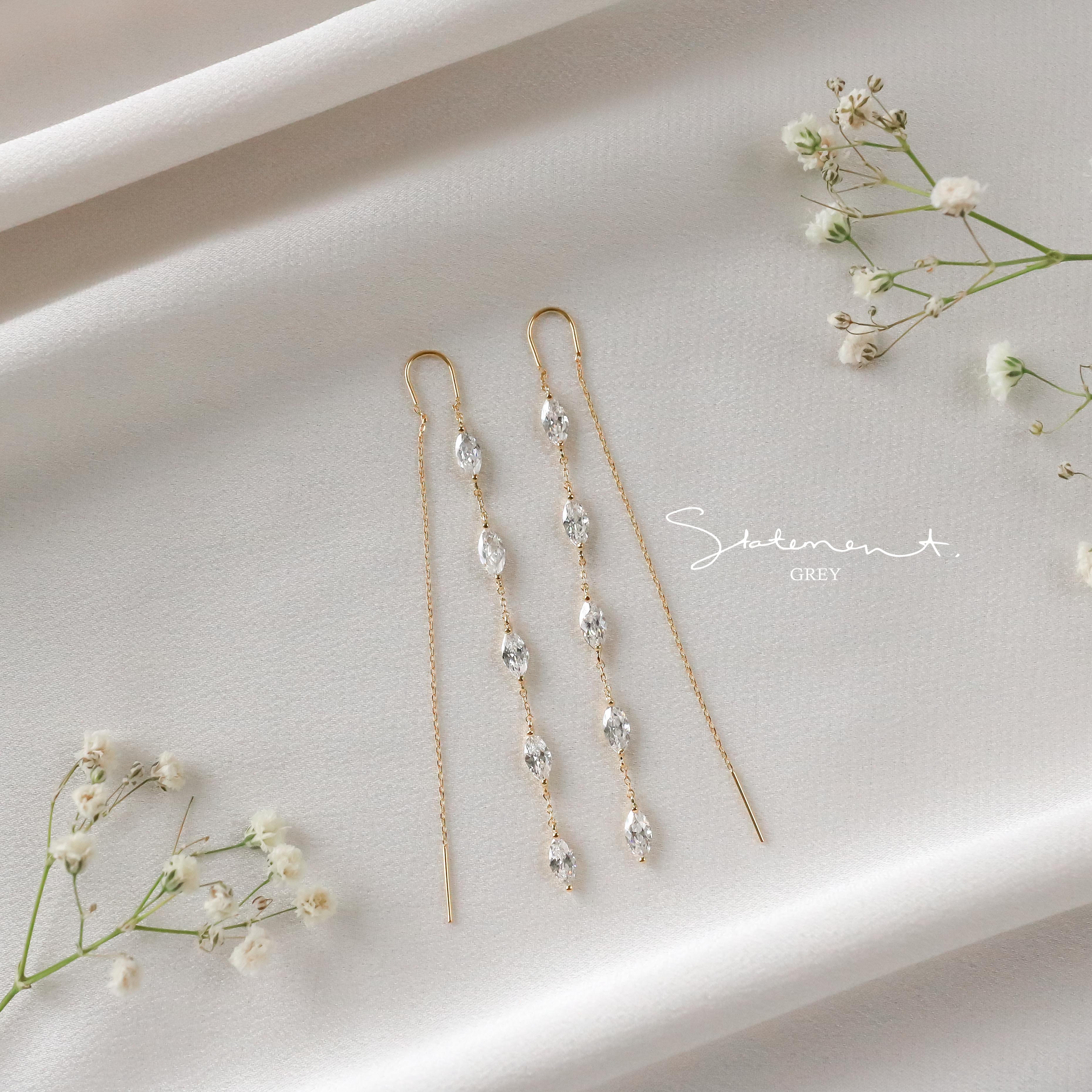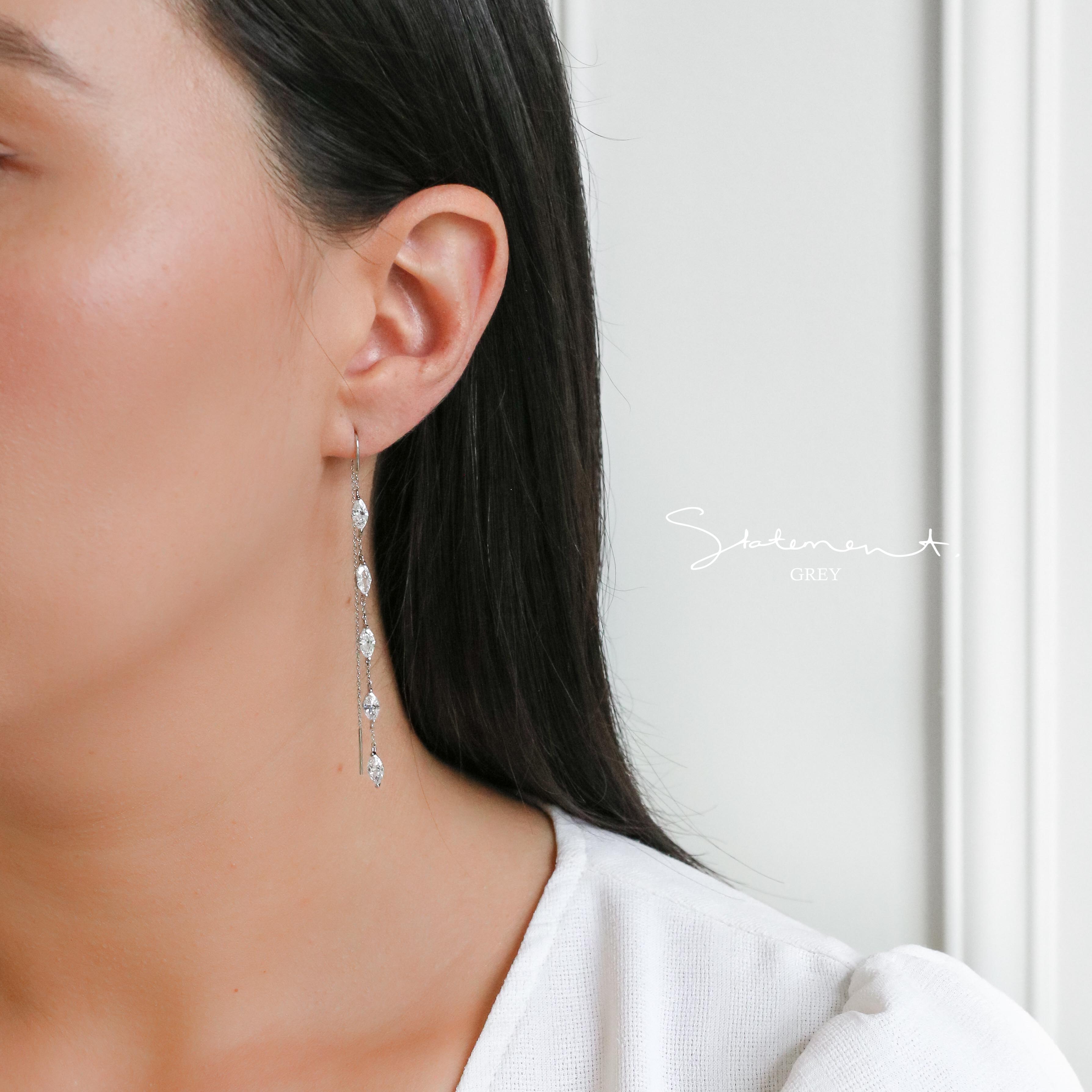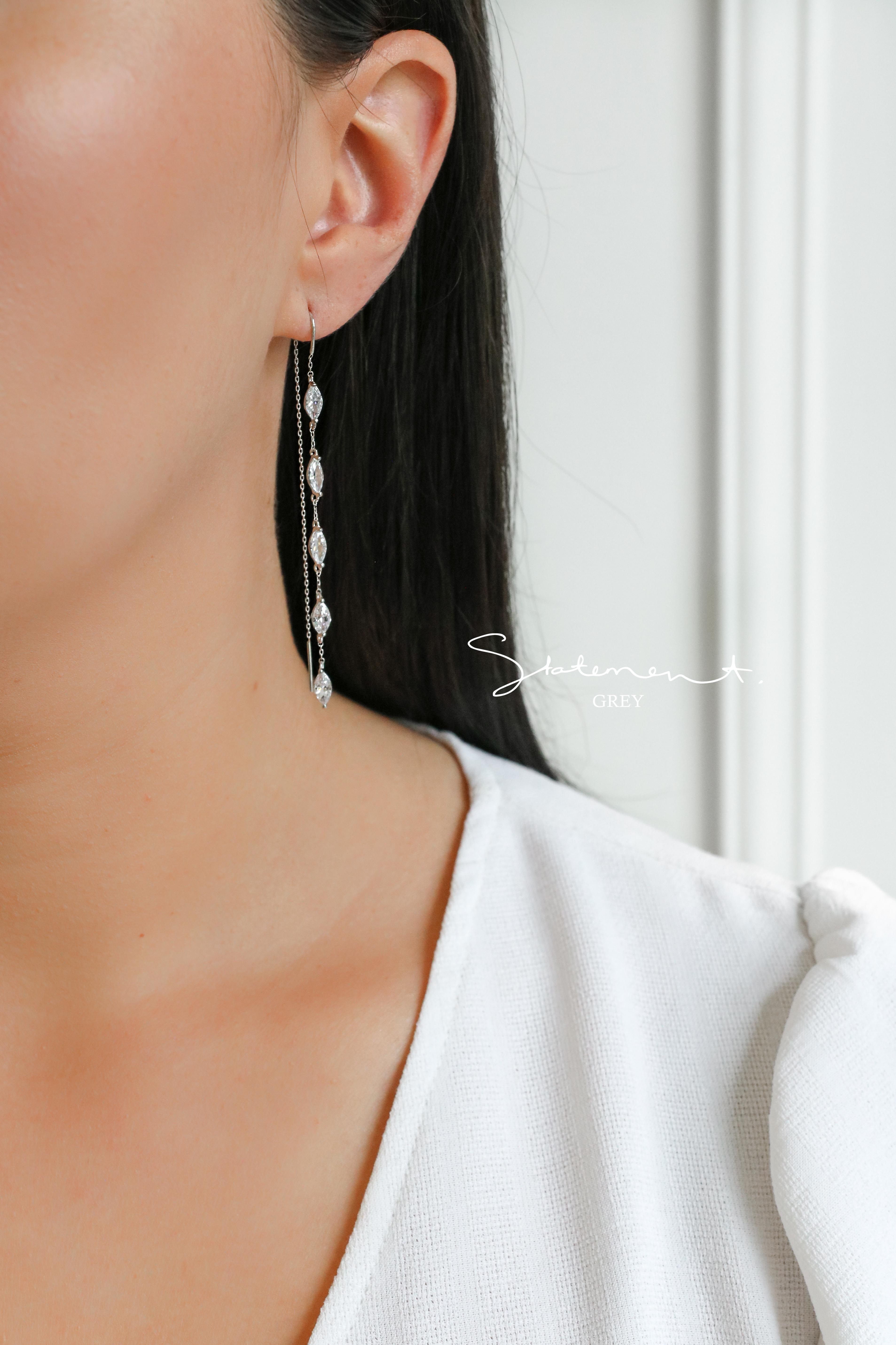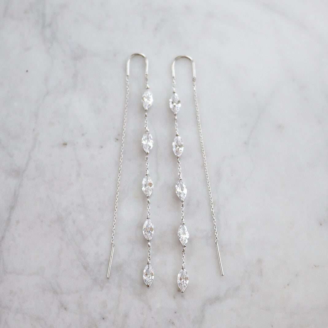 These charming Dahlia Earrings sparkle with five marquise-cut crystals and a playful chain thread design. Just slide the backing through for an effortlessly stunning look that’s perfect for date nights or a romantic beach stroll. Lightweight and dainty, they’re also a lovely choice for bridal parties or thoughtful bridal gifts.