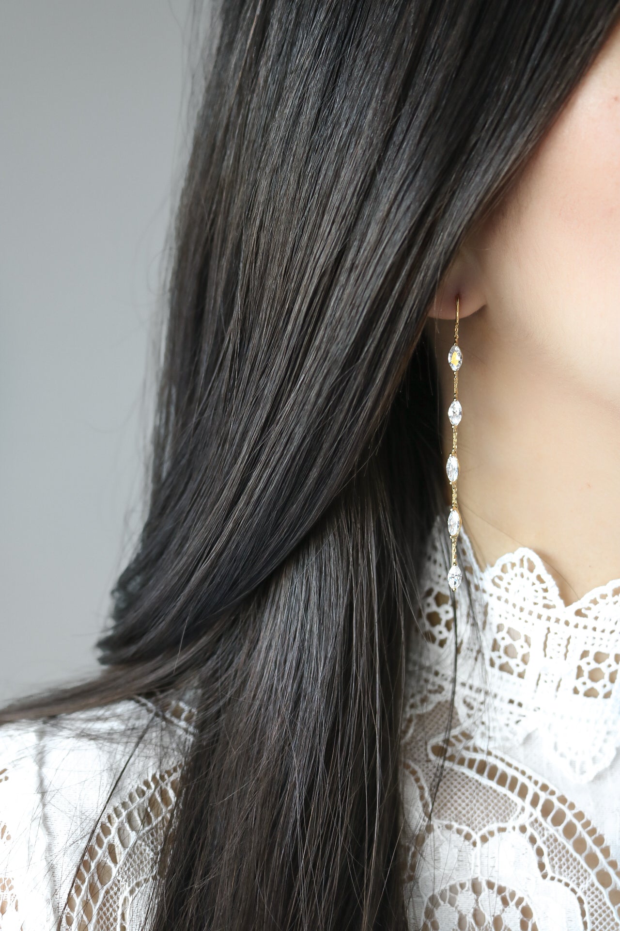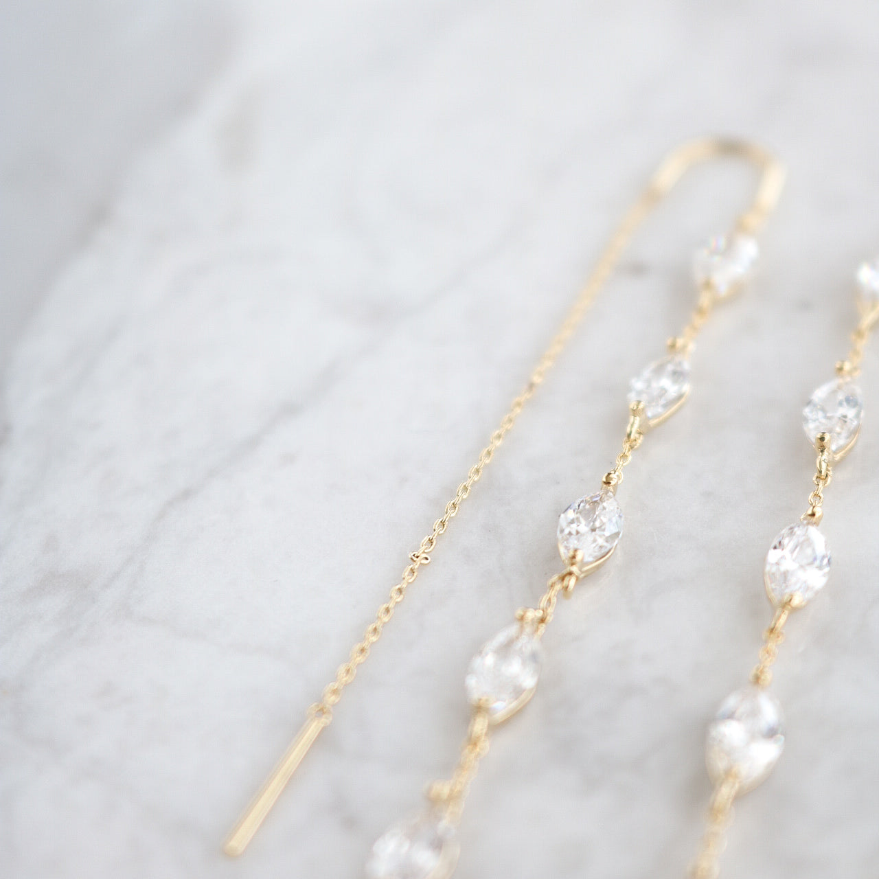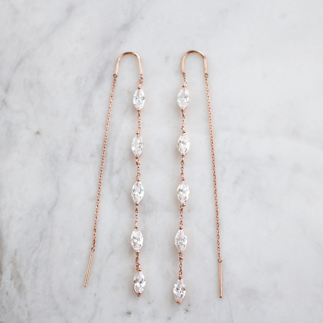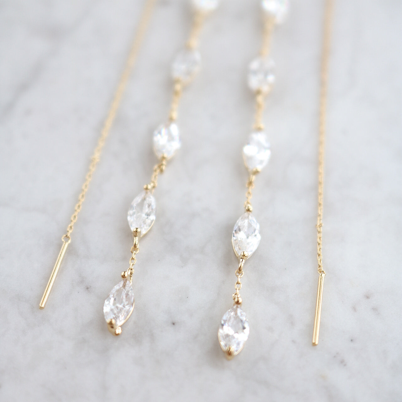 These charming Dahlia Earrings sparkle with five marquise-cut crystals and a playful chain thread design. Just slide the backing through for an effortlessly stunning look that’s perfect for date nights or a romantic beach stroll. Lightweight and dainty, they’re also a lovely choice for bridal parties or thoughtful bridal gifts.