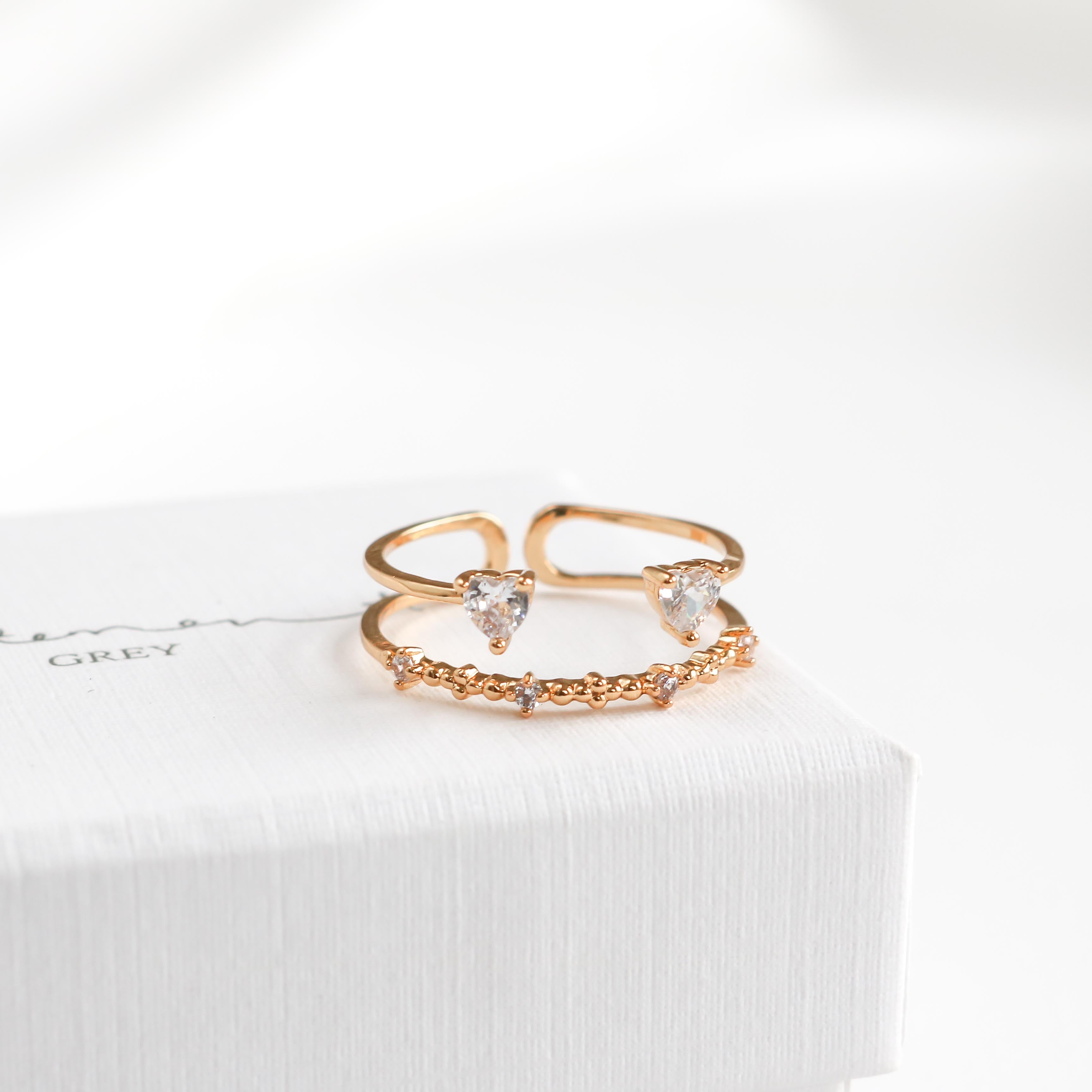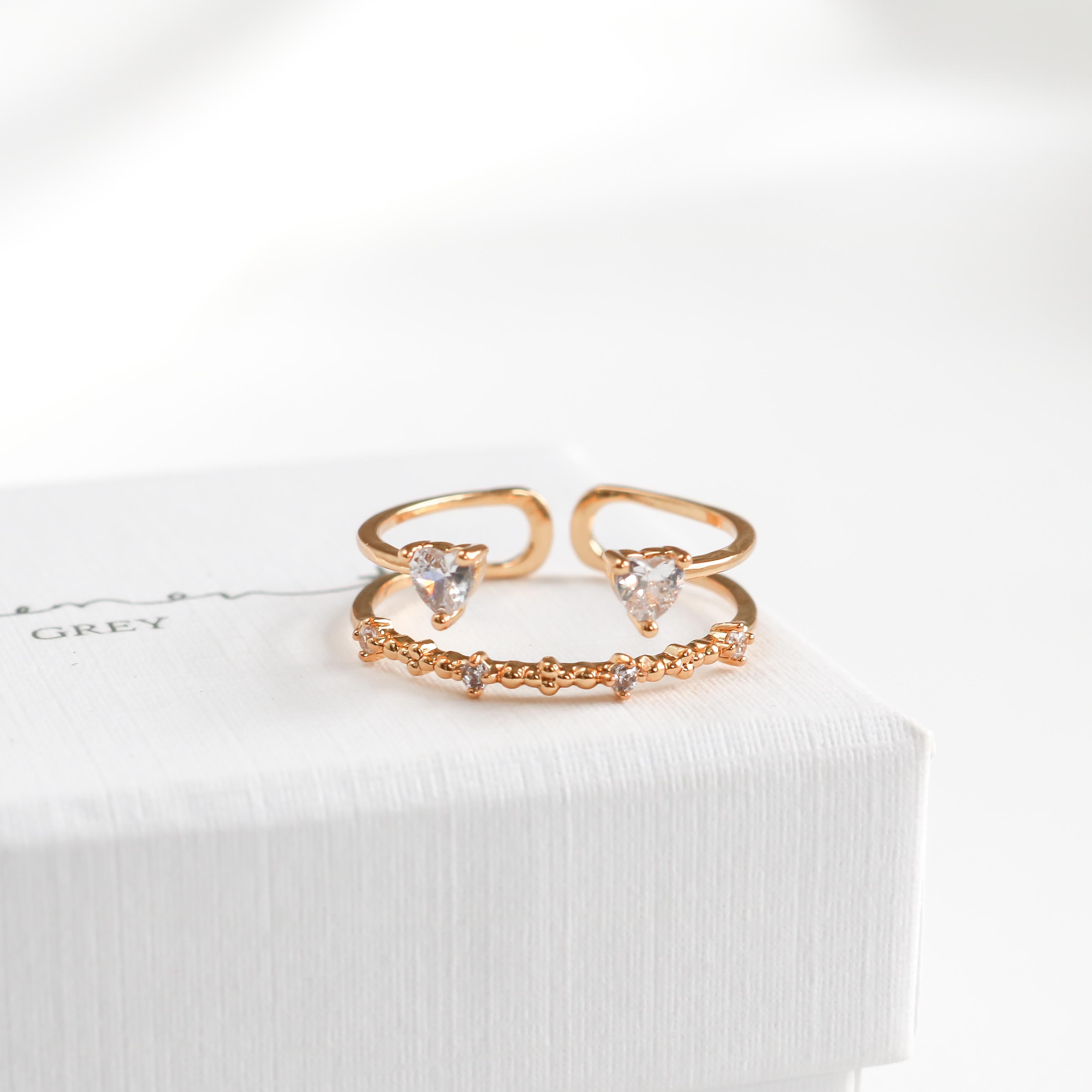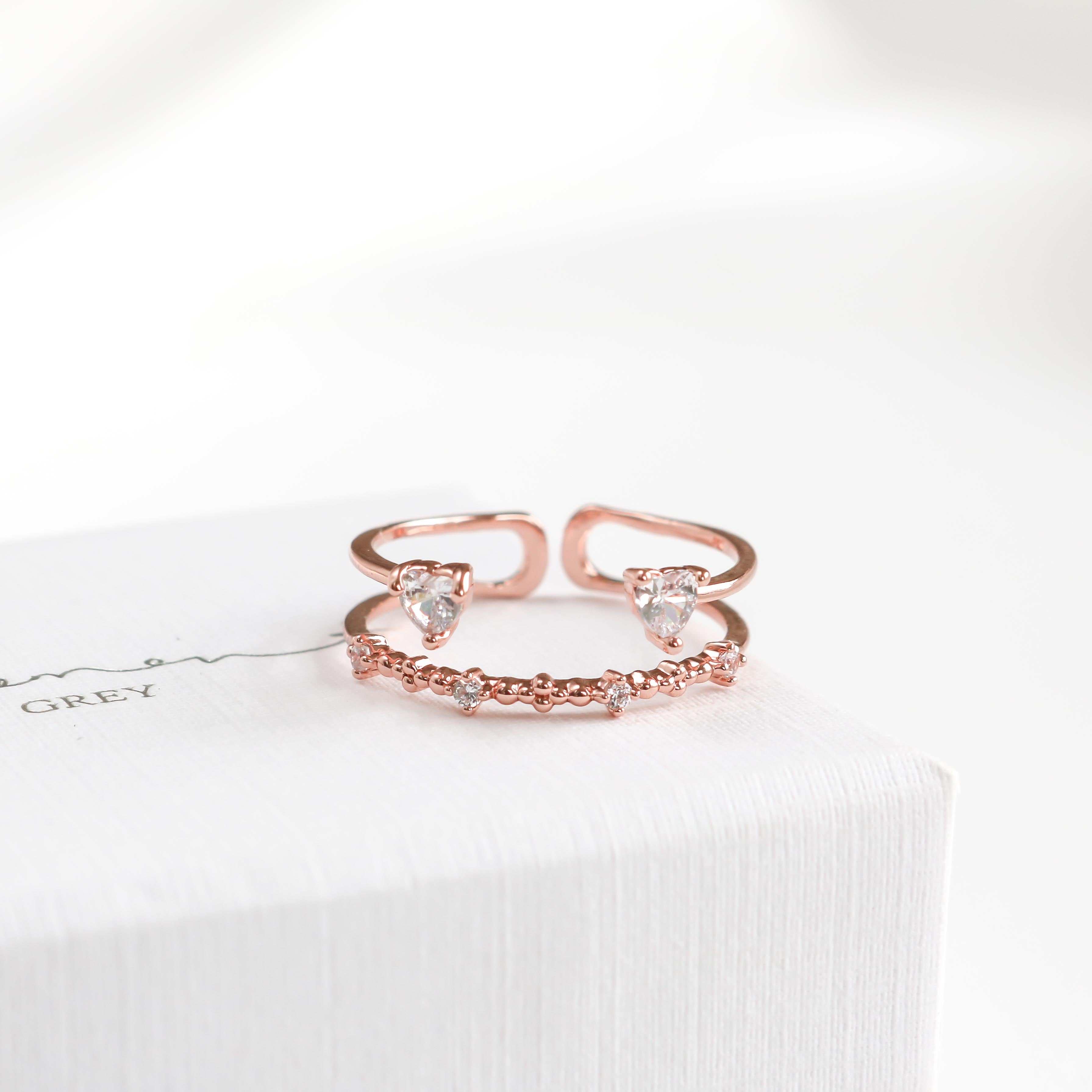 This gem has two heart shaped crystals free floating on a double band that is finished with a beaded detail and rounded crystal on the bottom.