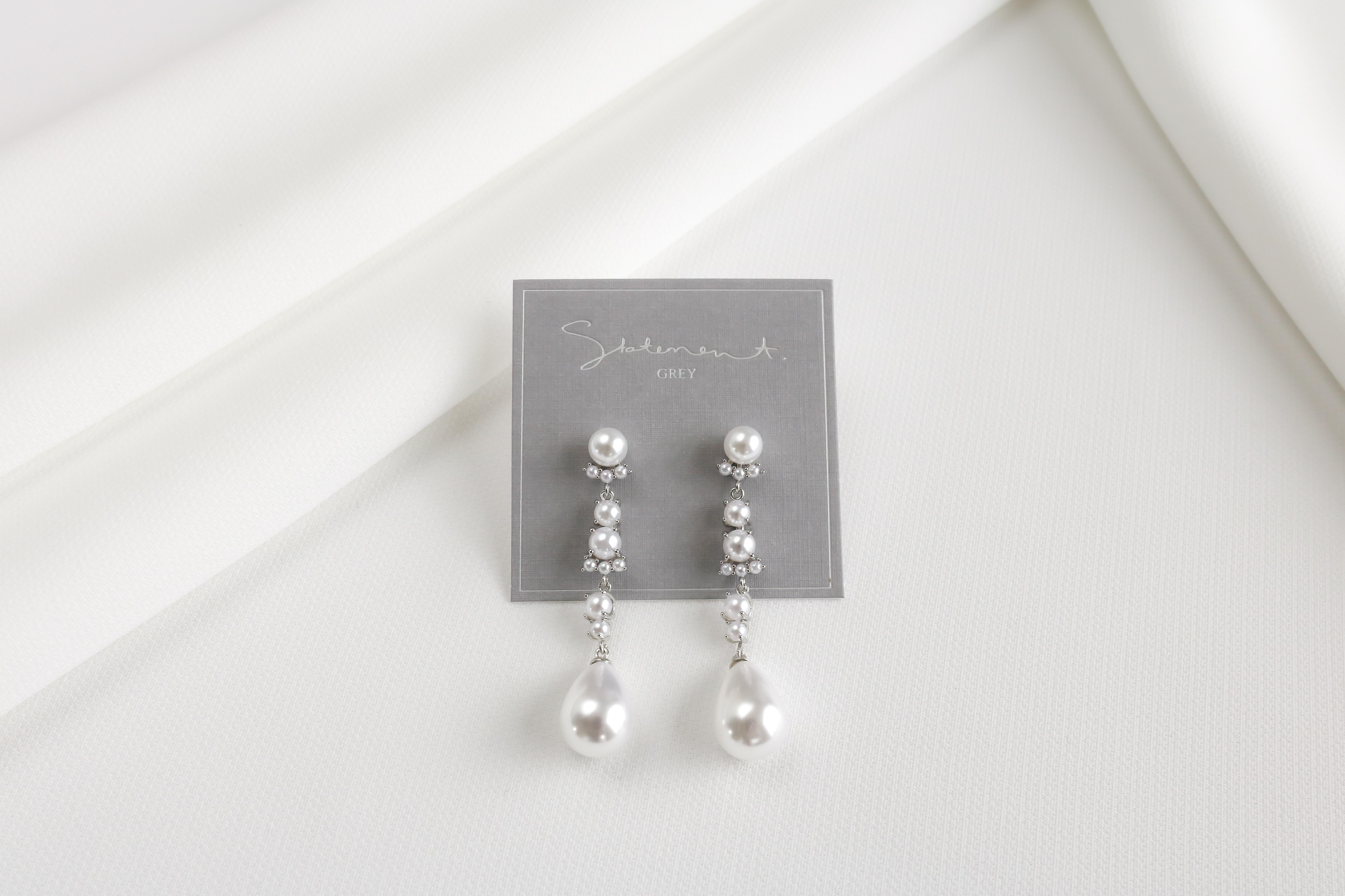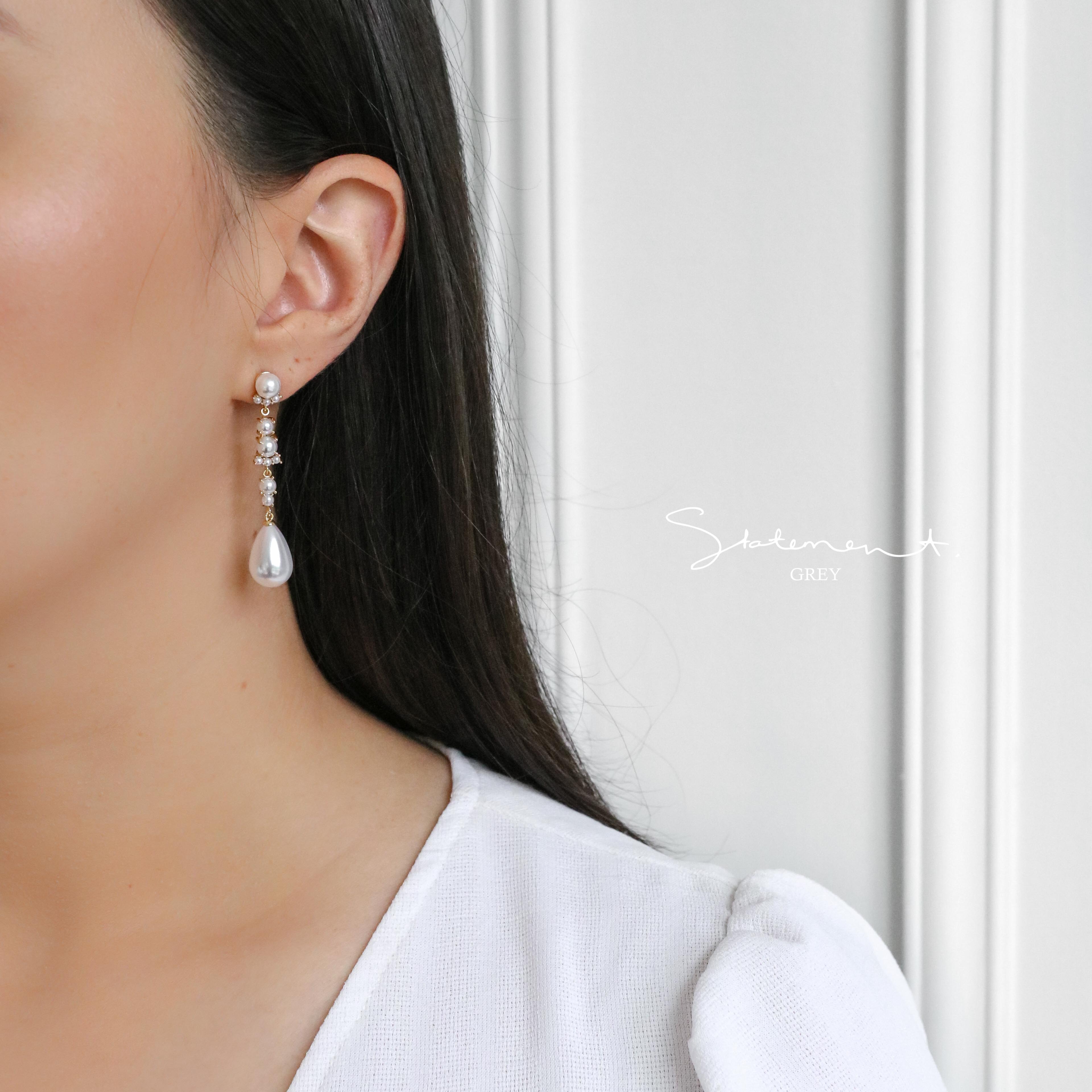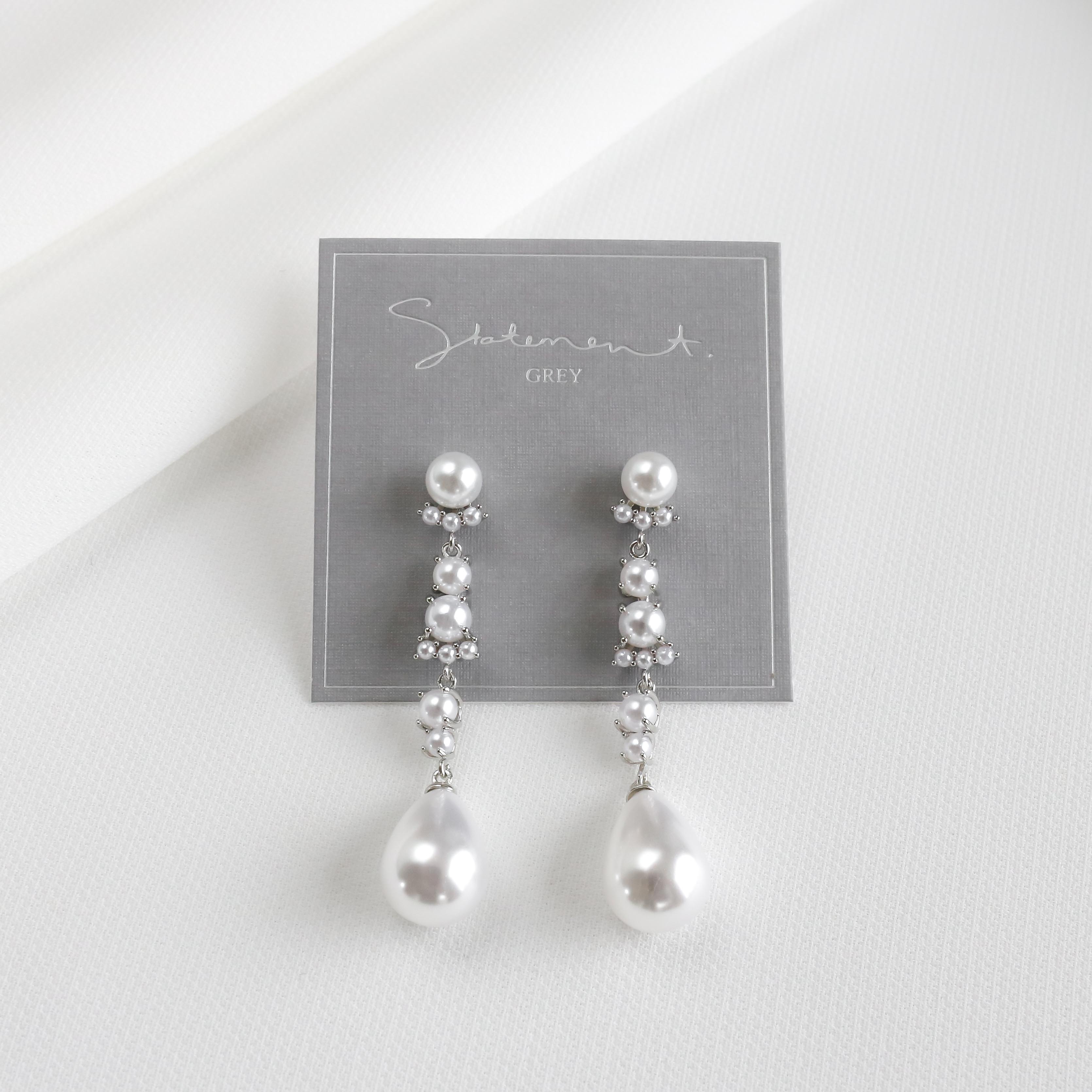Complete your bridal look with our Gigi Pearl Drop Earrings. These high quality earrings feature a unique layered design with varying sized pearls, making them the perfect accessory for any modern bride. Elevate your bridal style with this timeless and minimalistic jewelry piece.