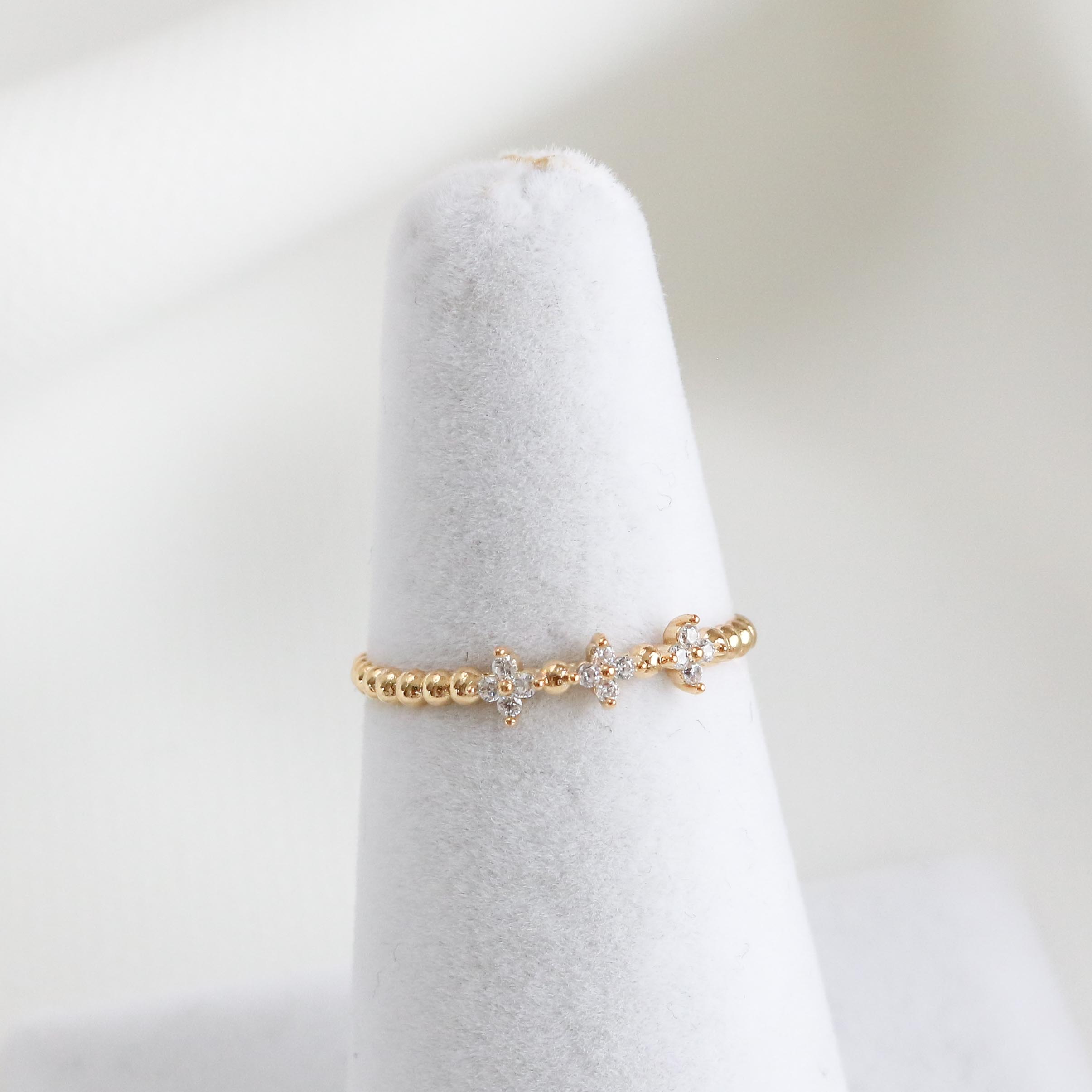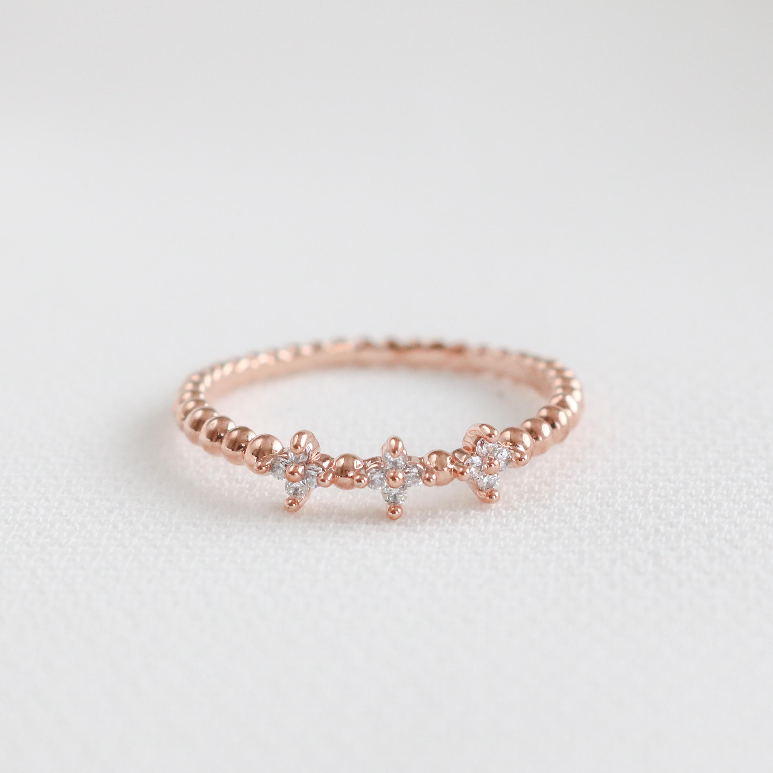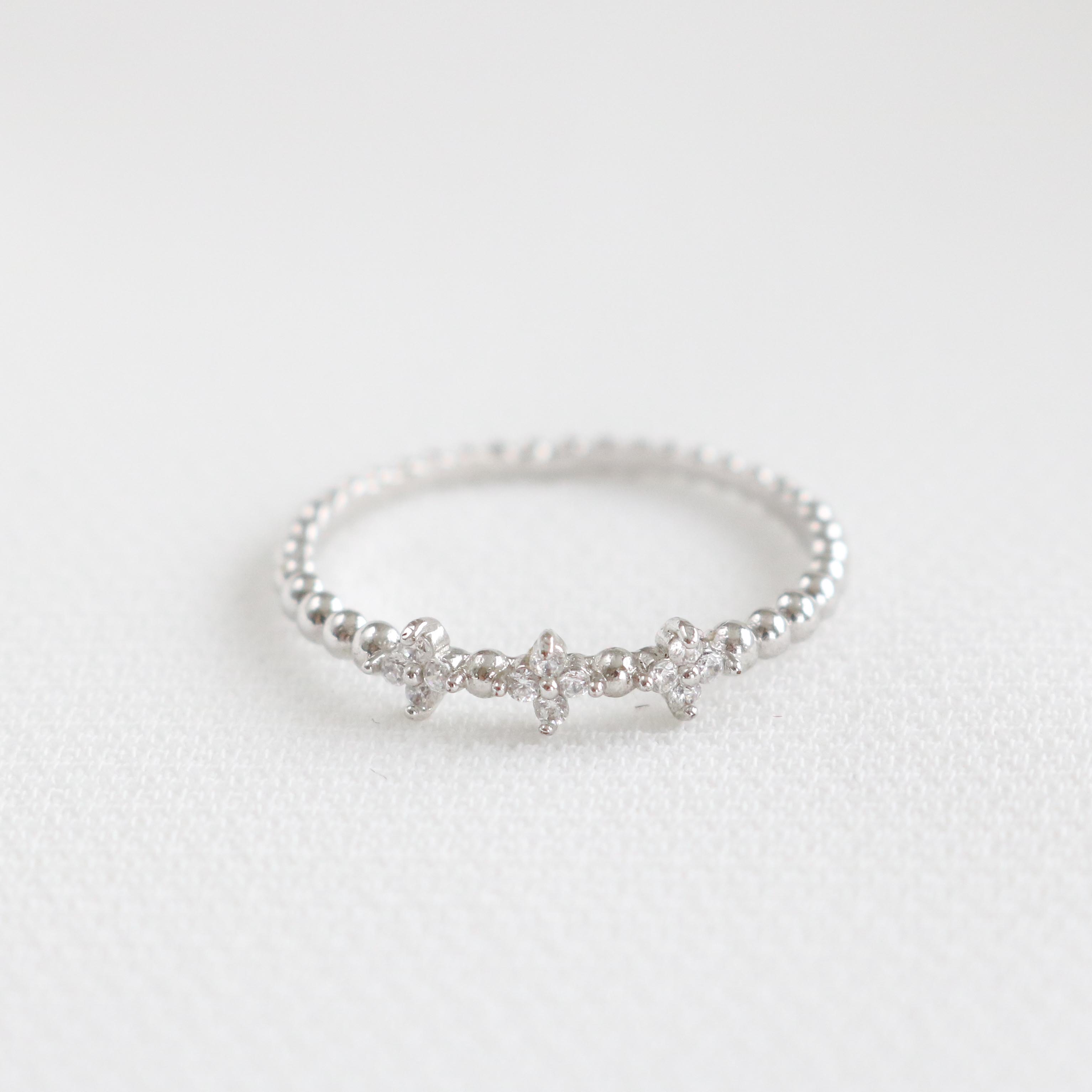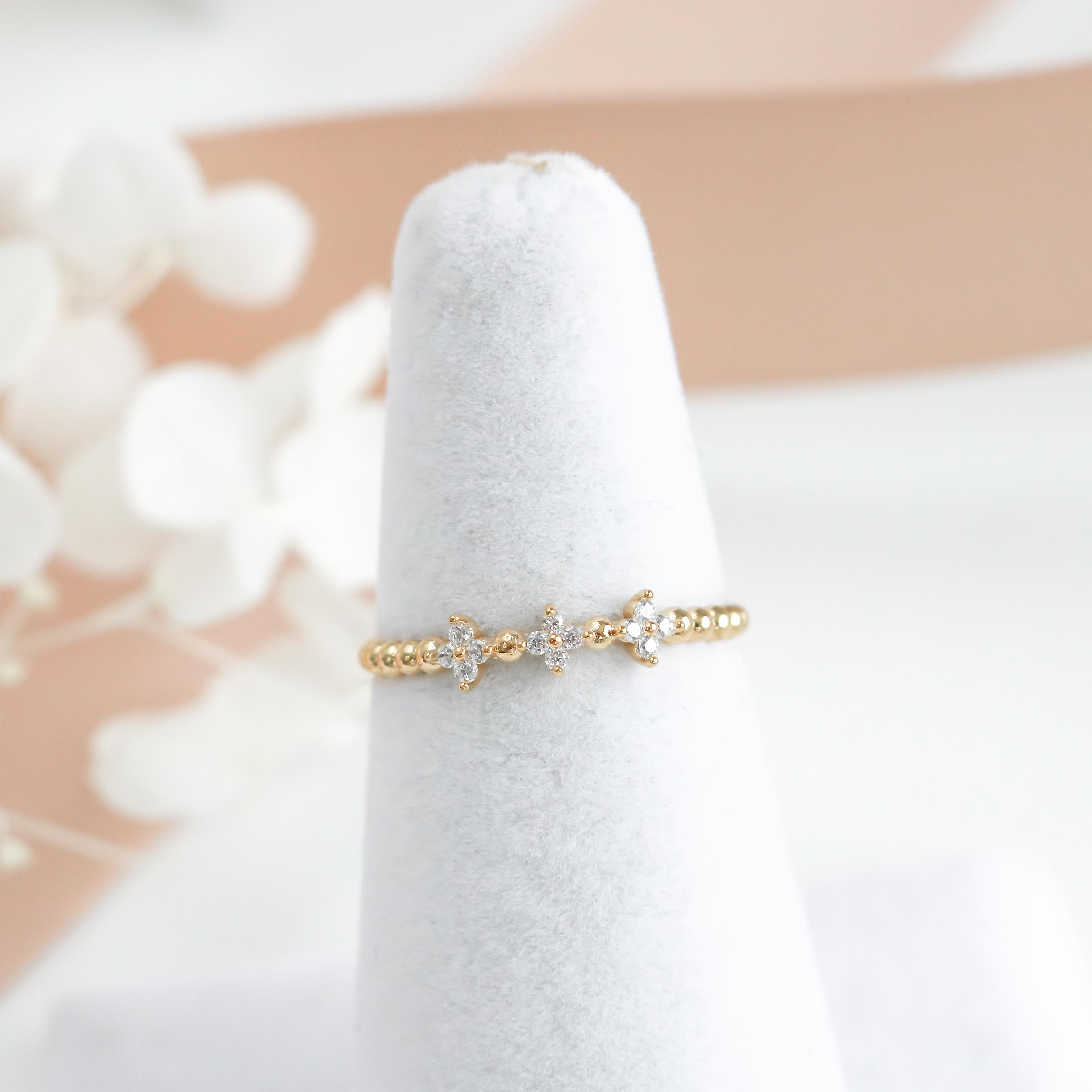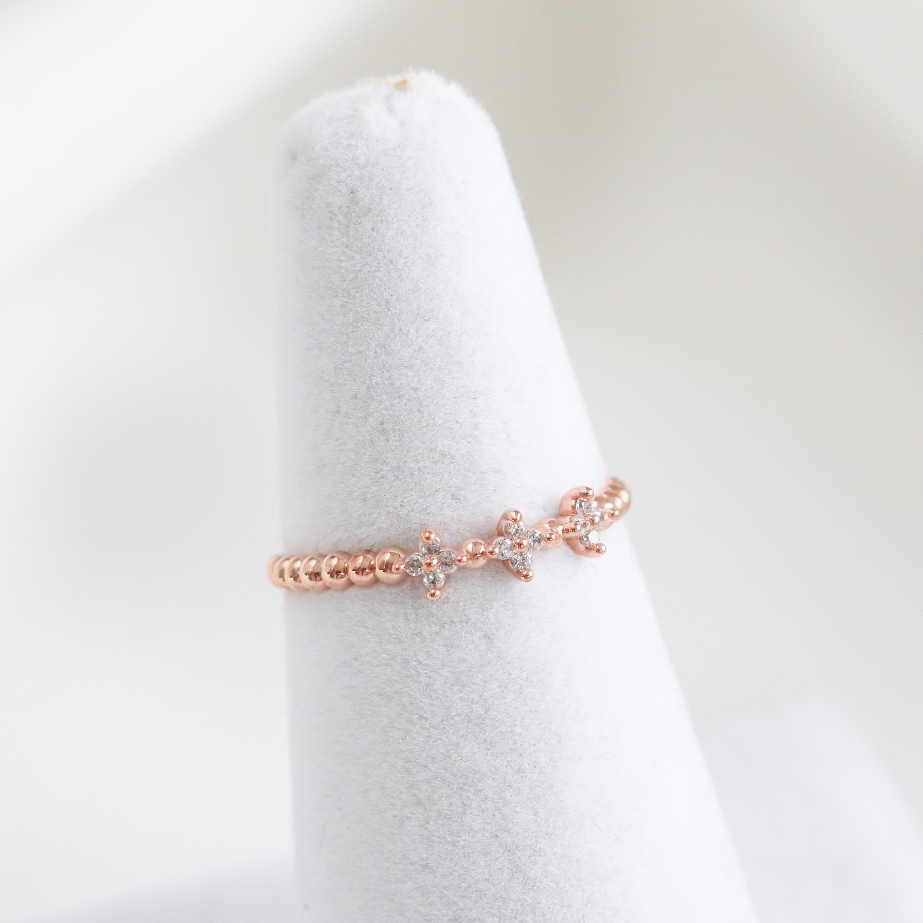 For the lovers of the cherry blossom season, this Blossom collection is for you. This floral ring features three blossoms on a beaded band.