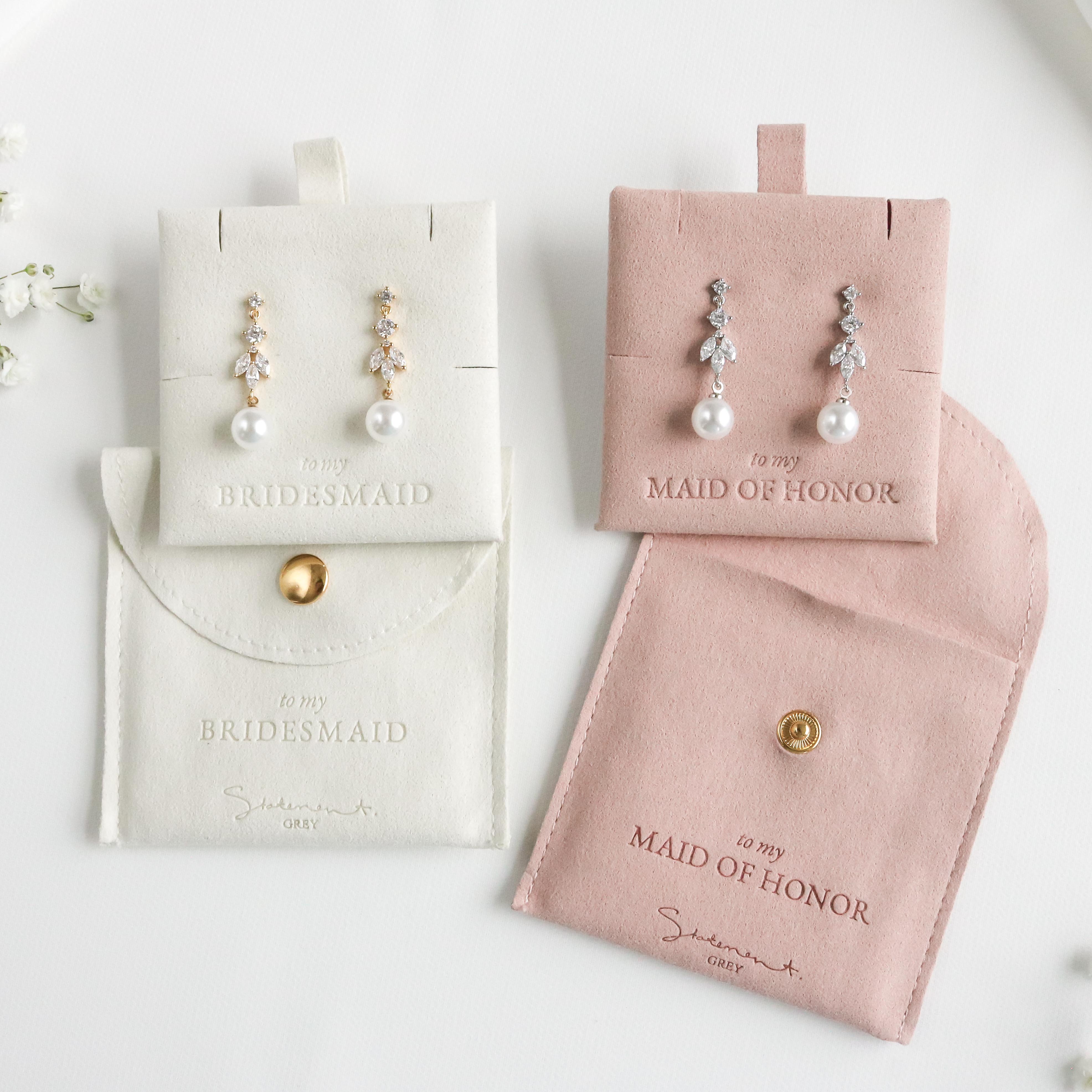 Presented in a charming keepsake gift pouch, they're the ideal way to thank your bridesmaids and maid of honor for standing by your side. Available in soft ivory and dusty pink.